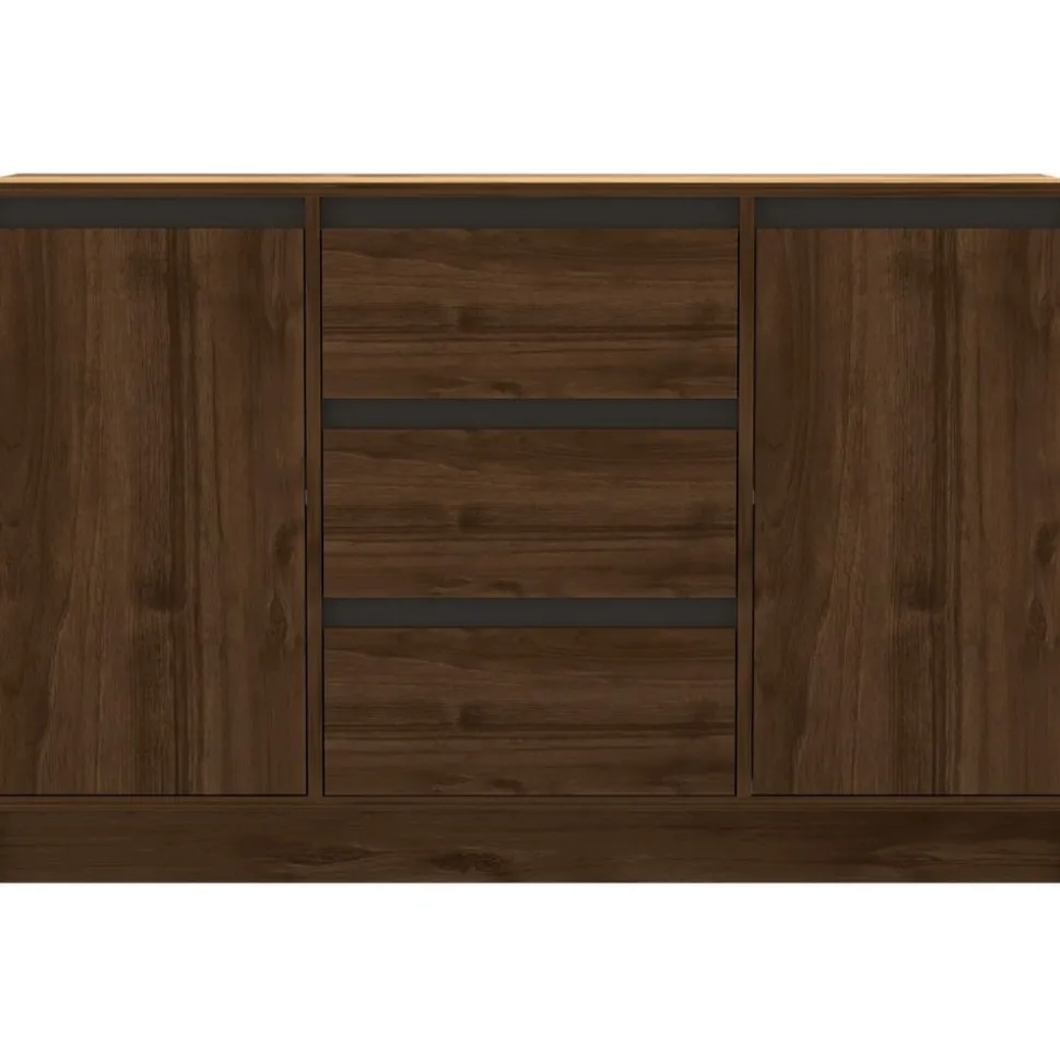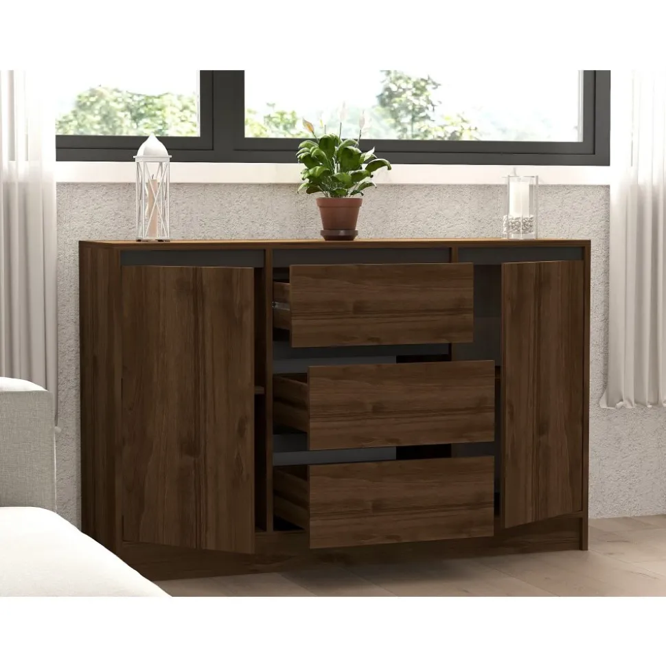 Skänk av melaminbelagd spånskiva med ben av plast.