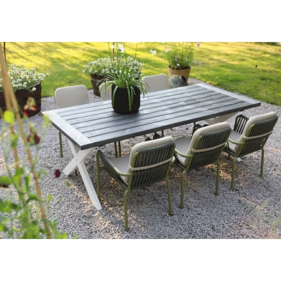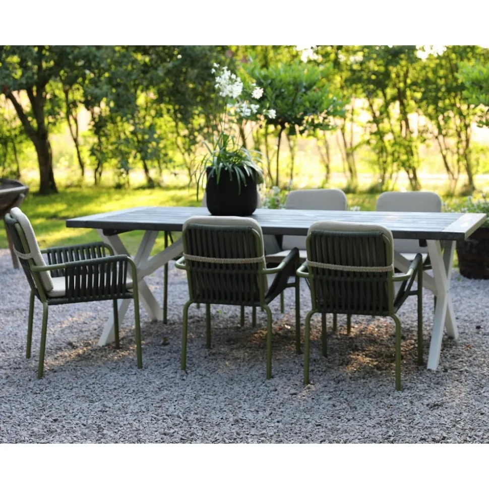 Inklusive 6 st sköna Lincoln stapelbara karmstolar i grönlackad aluminium stomme med en beioge dyna för rygg och sits. Matgruppen passar perfekt på altanen, uteplatsen och i uterummet.