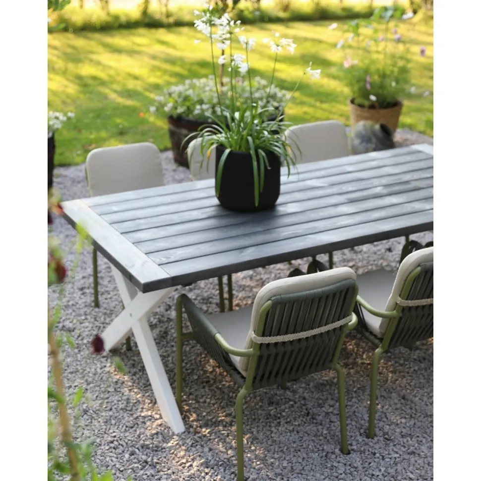 Matgrupp innehållande matbord i grålaserad toppskiva i furu med kryssben i vitlackat trä. Bordet har kryssben och bordsyta av plank, ger ett robust och karaktäristiskt utseende.