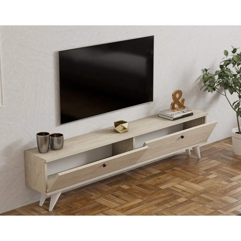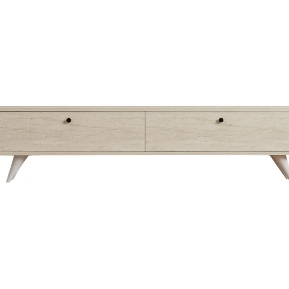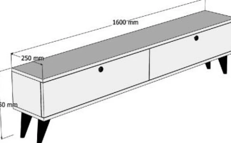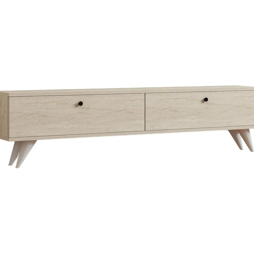 Mediabänk av melaminbelagd spånskiva med ben av plast.