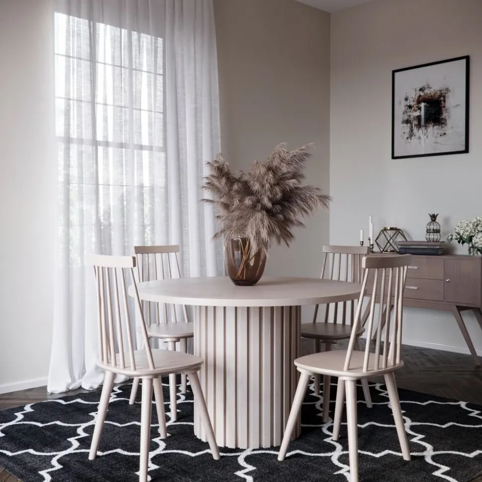 Vår PiPi bordsserie står för hantverk, design och hållbarhet. Vi erbjuder valnöt, whitewash, svartbetsat trä och ek. Serien innehåller olika storlekar och utföranden. Välj just ditt utförande för matplatsen. Denna modellen har en snygg runt toppskiva i utförandet fanèrad whitewash.