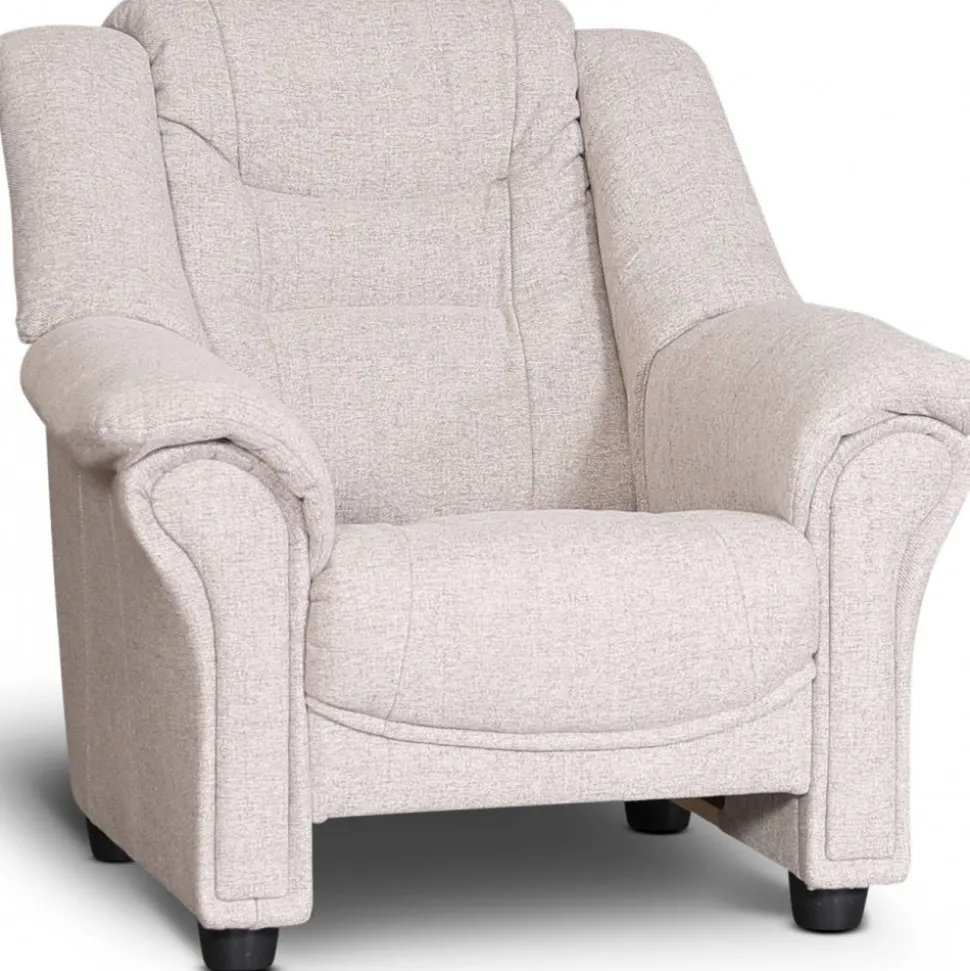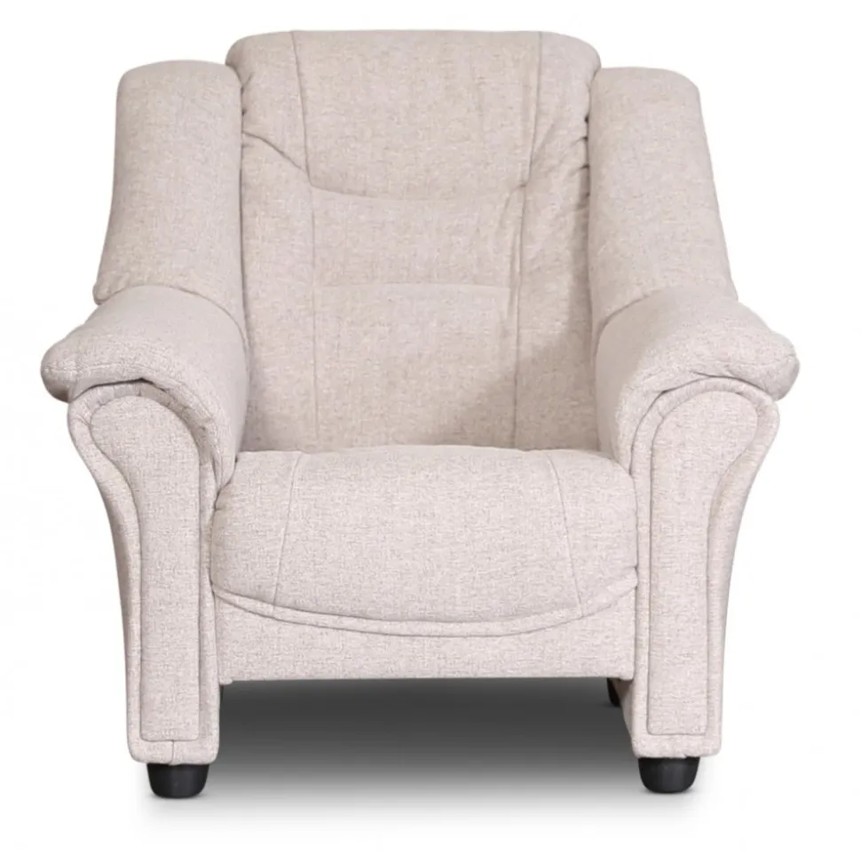 Plaza i beige mjukt tyg med svart ben. Klassisk fåtölj med hög rygg och god sittkomfort. Det är högt under fåtöljen för att underlätta med dammsugning av robotdammsugare.
