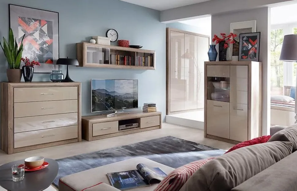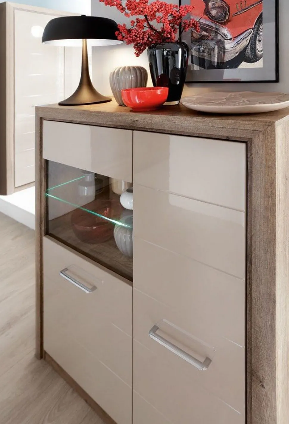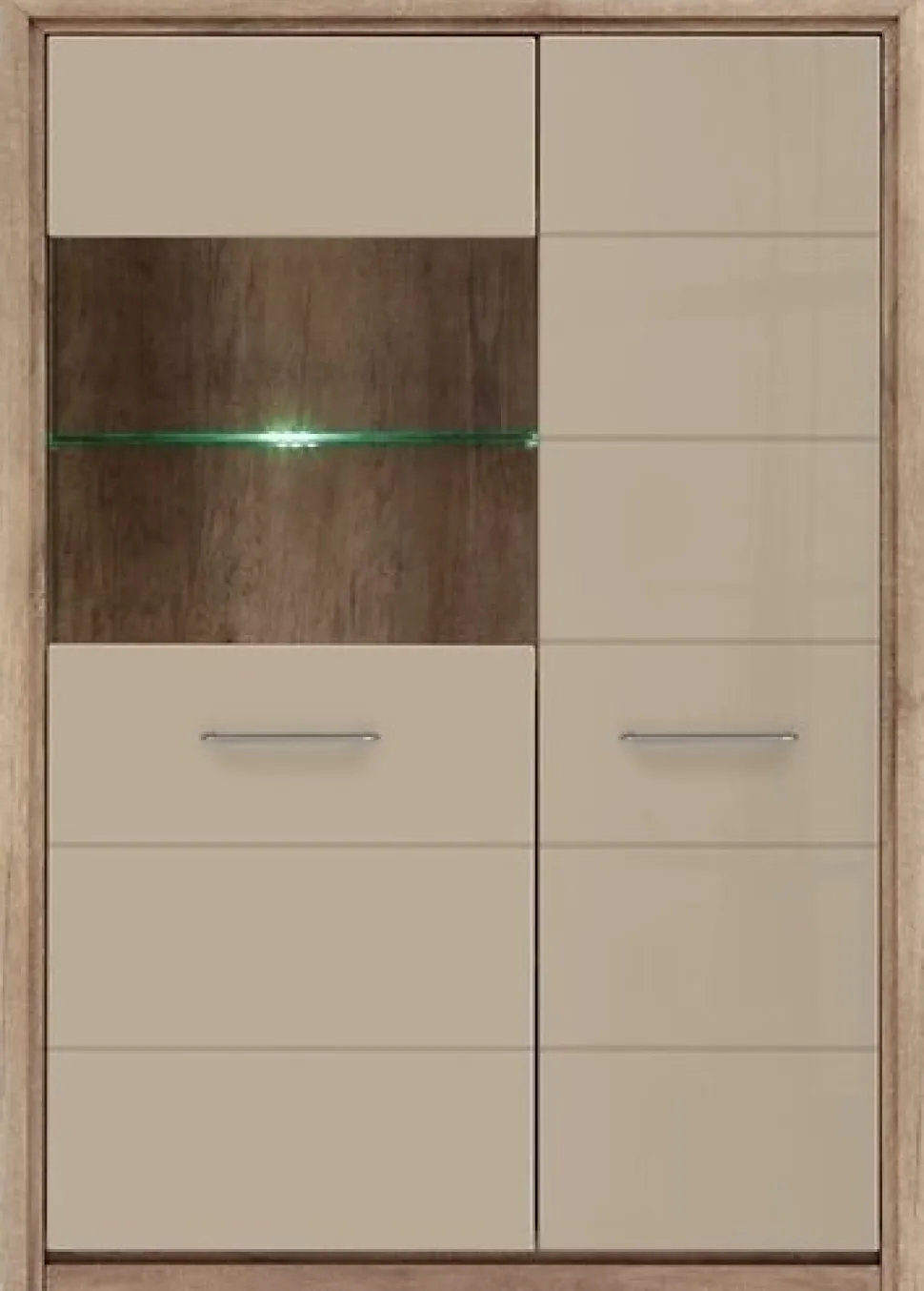 Ett fint i ekimitaion med beige fronter. Skåpet har två dörrar varav den ena har ett integrerat glas, vilket ger möjlighet att båda visa upp och dölja saker. Det är inrett med många hyllplan som gör det enkelt att hålla ordning på sakerna.