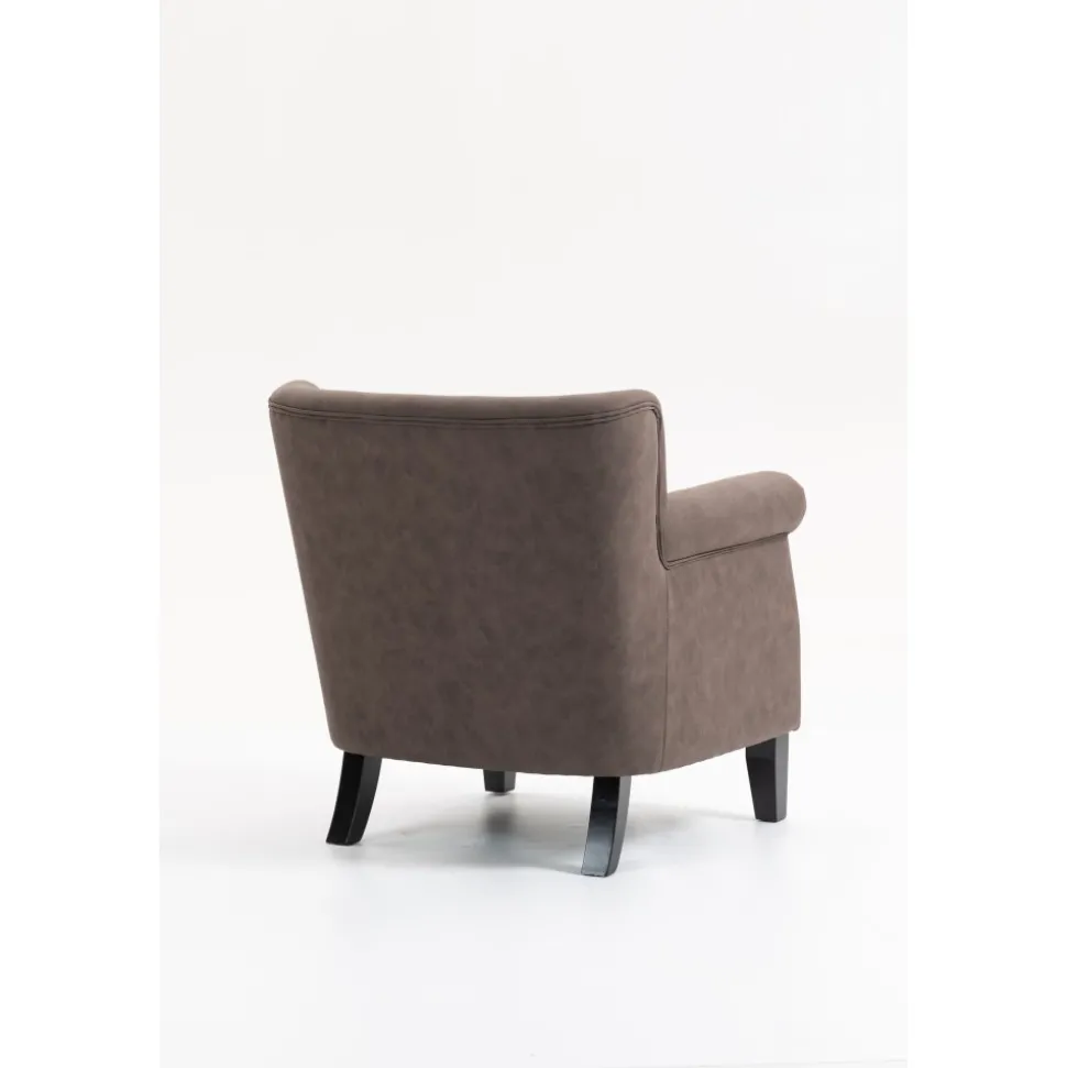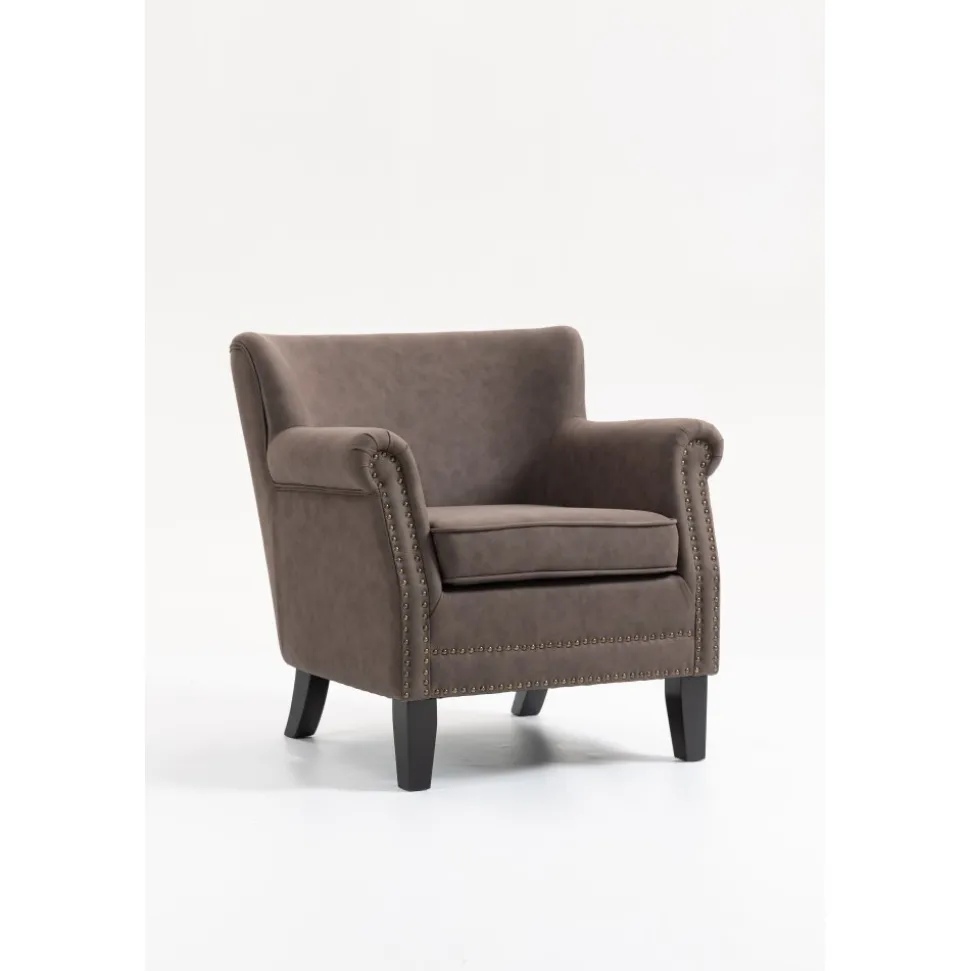 Elegant professorfåtölj klädd i mörkbrunt konstläder (PU) med dekorativa nitar på framsidan. Fåtöljen står stadigt på svarta ben och levereras färdigmonterad redo att användas direkt.