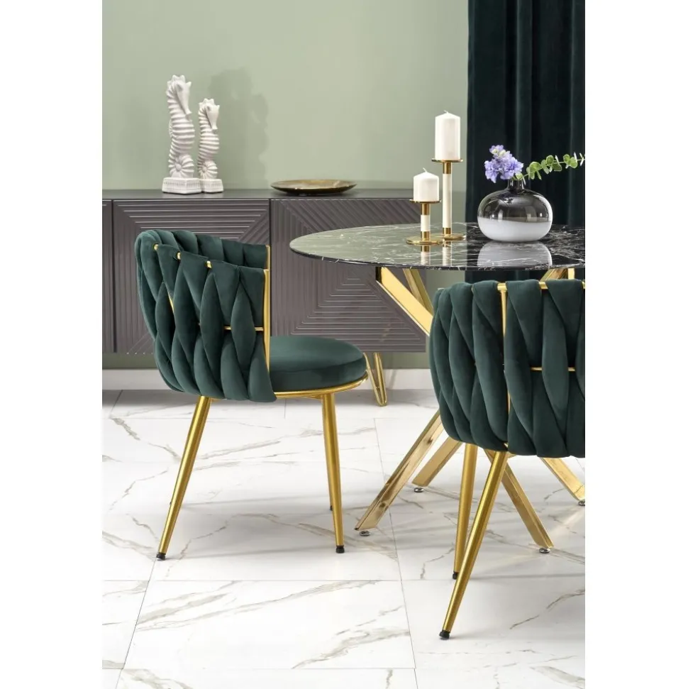 Matbord med bordsskiva av glas med marmoreffekt och underrede av kromat stål.