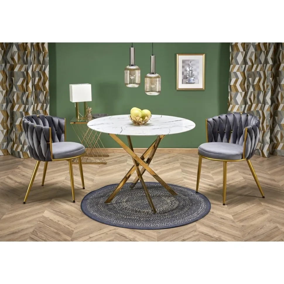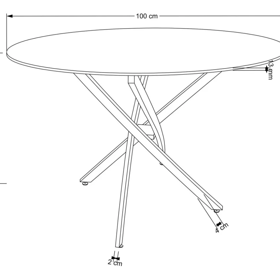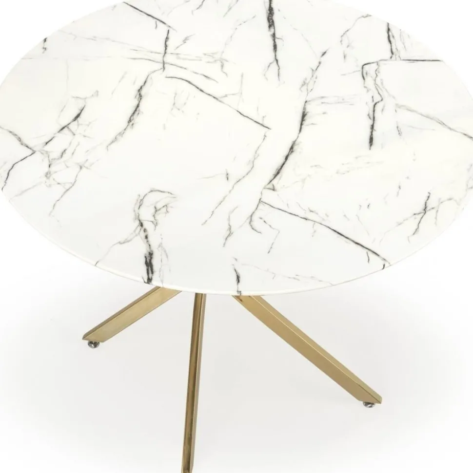 Matbord med bordsskiva av glas med marmoreffekt och underrede av kromat stål.