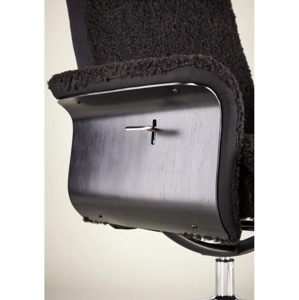 Hagön-serien erbjuder fåtöljer med fotpallar som kombinerar modern design med maximal komfort. Klädd i mjukt fårskinnsliknande teddytyg ger Hagön en inbjudande och ombonad känsla. Den här modellen kommer i elegant svart teddy med sidopaneler i svartbetsad ekfanér och ett snurrbart stativ i kromad metall detaljer som lyfter helheten och ger ett exklusivt uttryck.