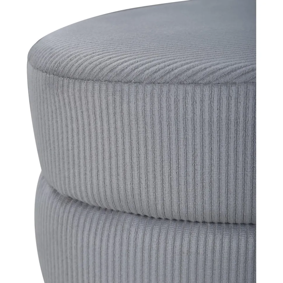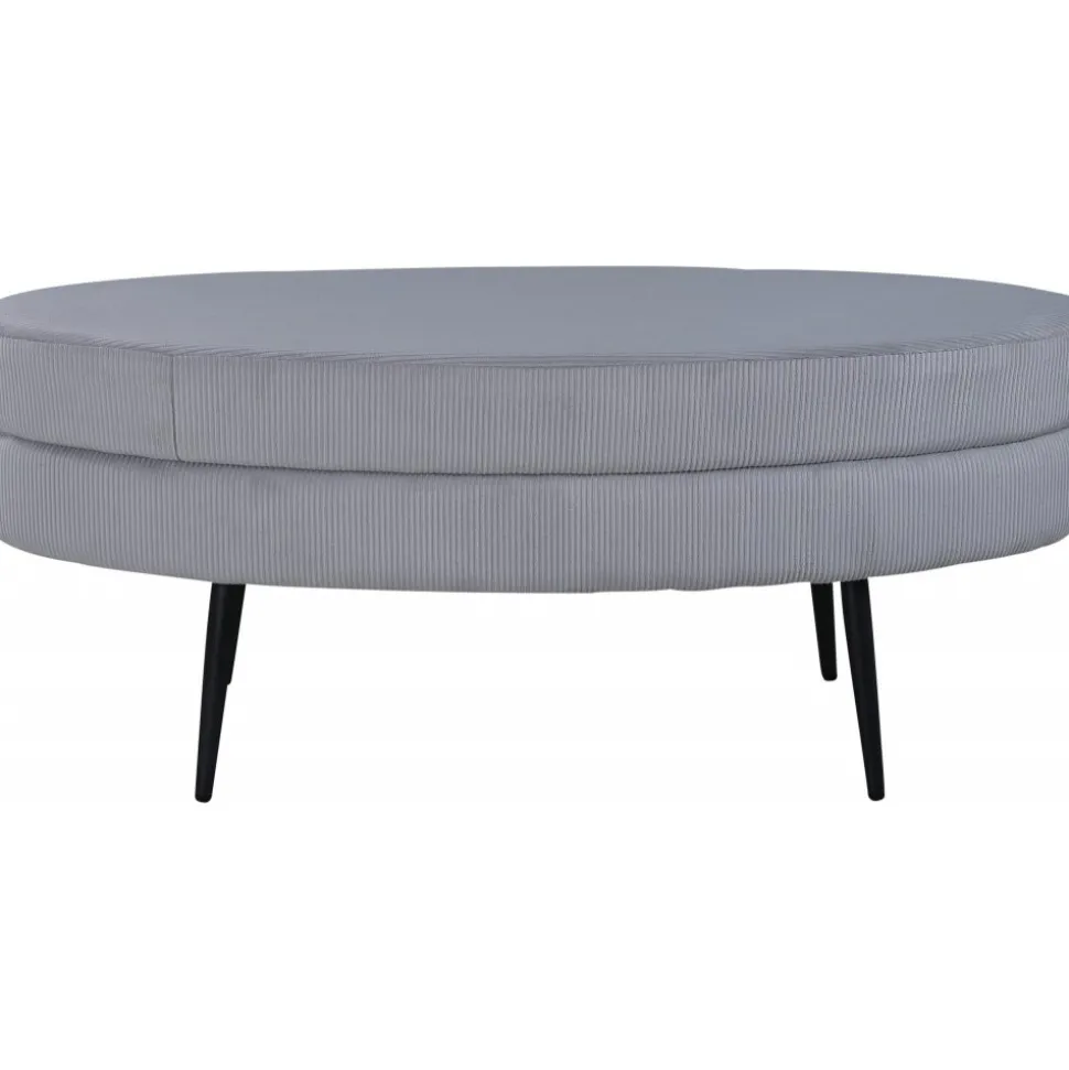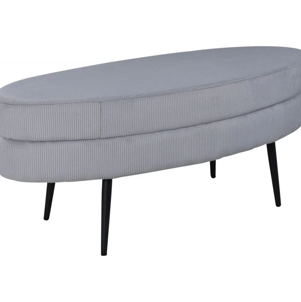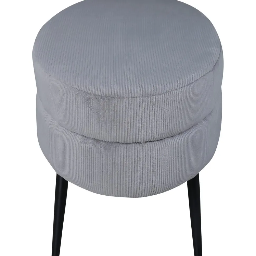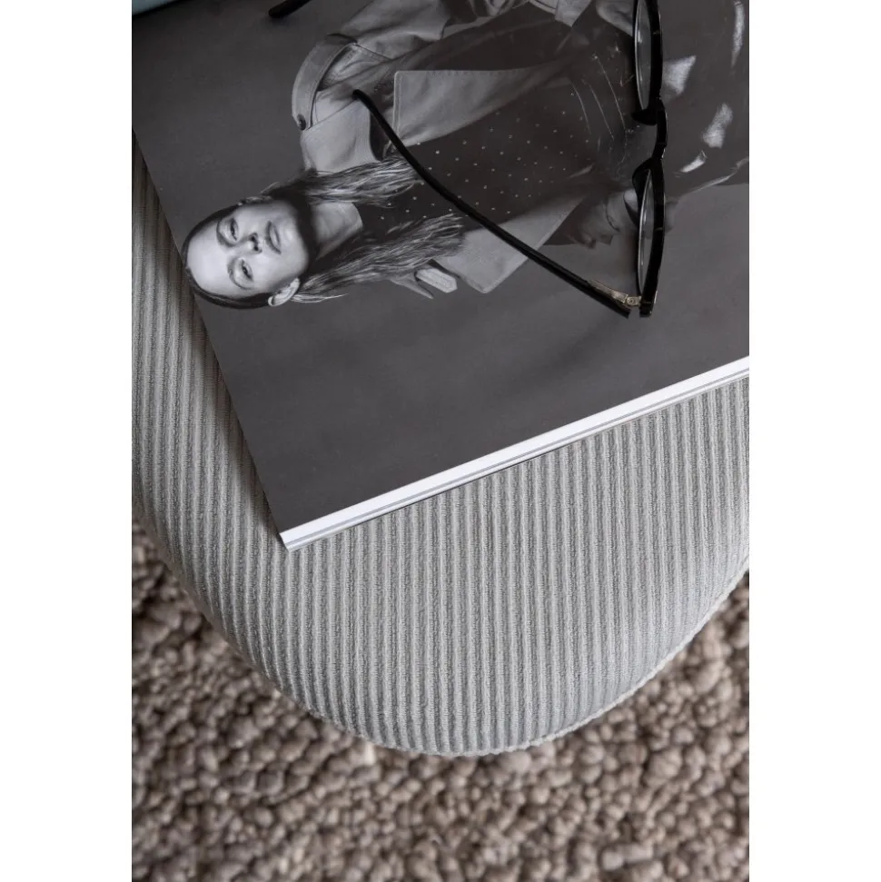 Sittpuff av trä och stål, klädd med polyestertyg.