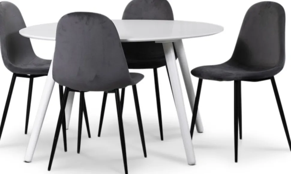 Matgrupp från Skånska Möbelhuset, Rosvik matbord 120 cm i diameter. Medföljer 4 st matchande Carisma sammetstolar i grått sammet med svarta ben.