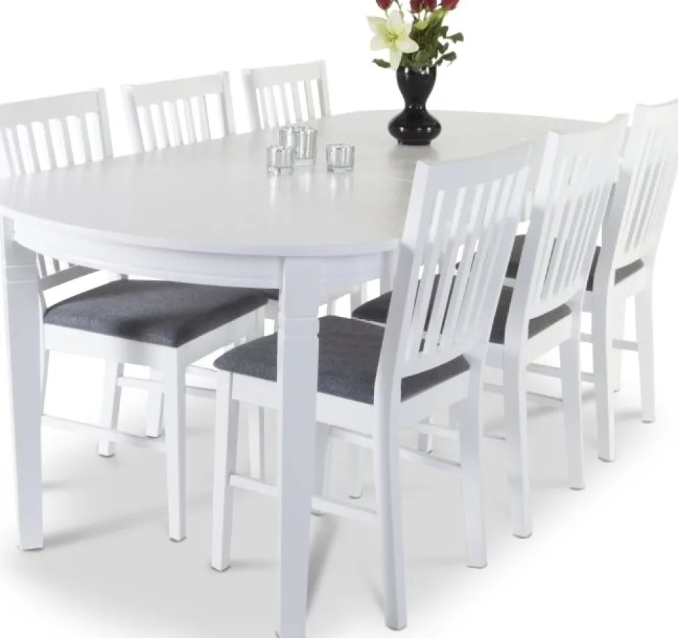 Sandhamn matgrupp ger dig ett bord i modernt utseende med matchande stolar. Vackert rundade kanter på bordet ger ett mjukt och harmoniskt uttryck. Robust i massivt vitlackerat hevea trä / MDF och med grått tyg på stolarna.