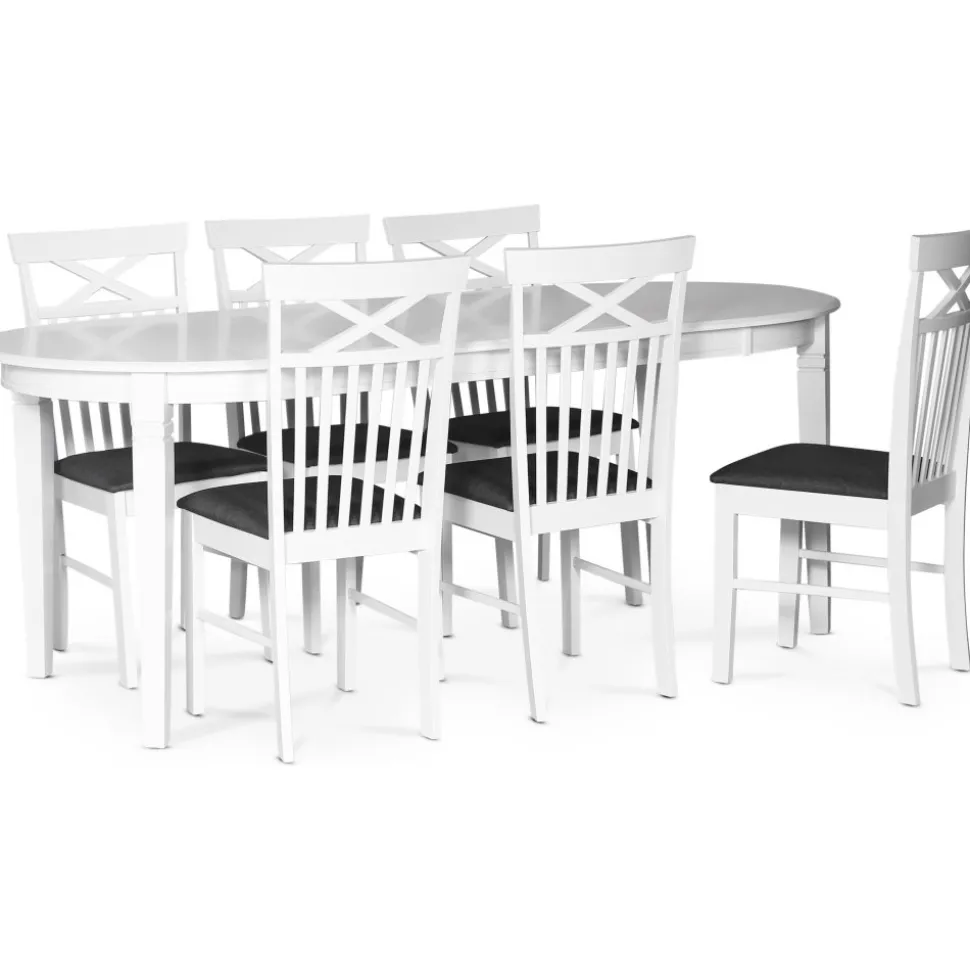 Sandhamn Klassiskt utförande. Stilrent Ovalt matbord med vitlackade ben och bordsskiva. Tillsammans med 6 st Sofiero matstolar blir det en perfekt kombination. Stolen med en skön sits klädd i antracitfärgat tyg.