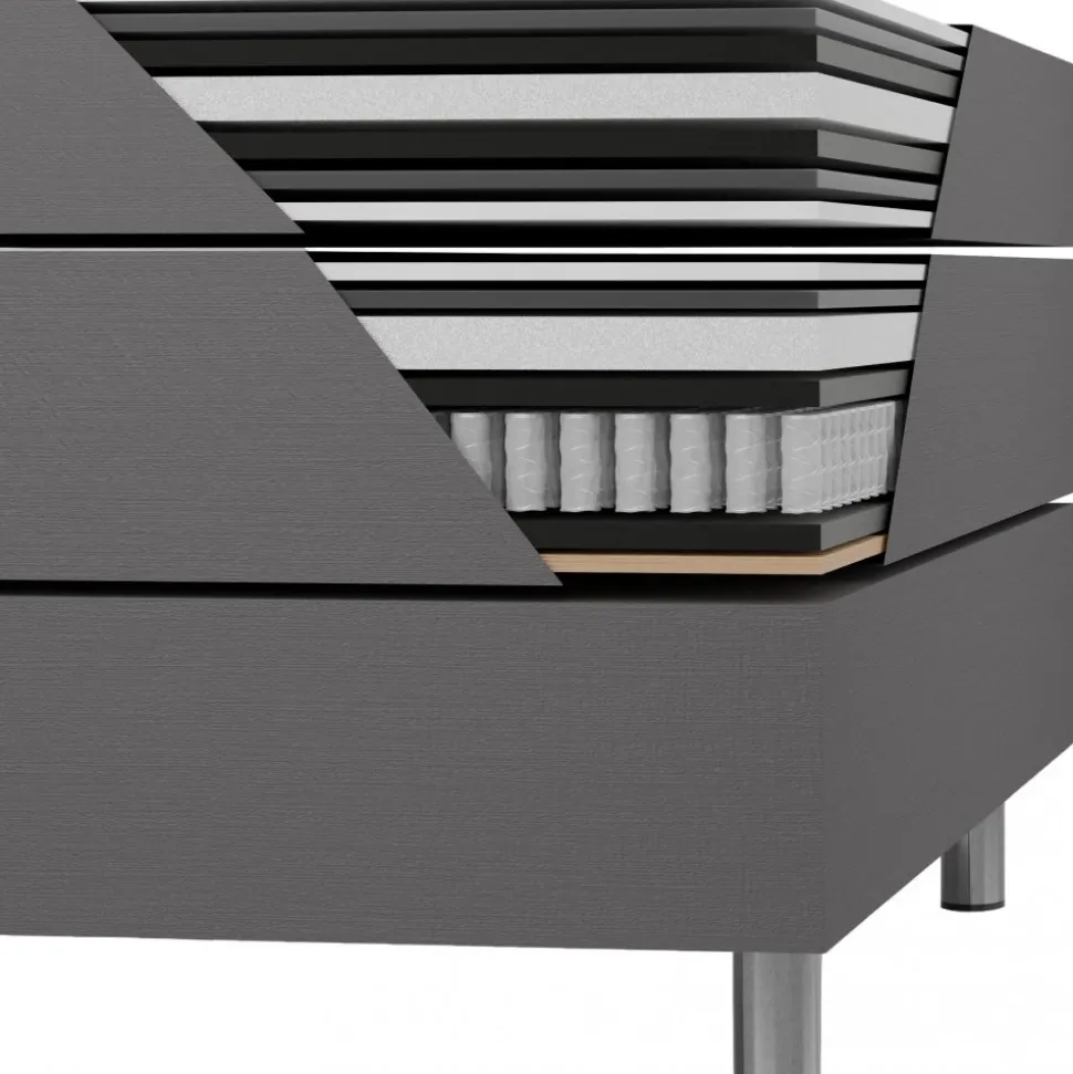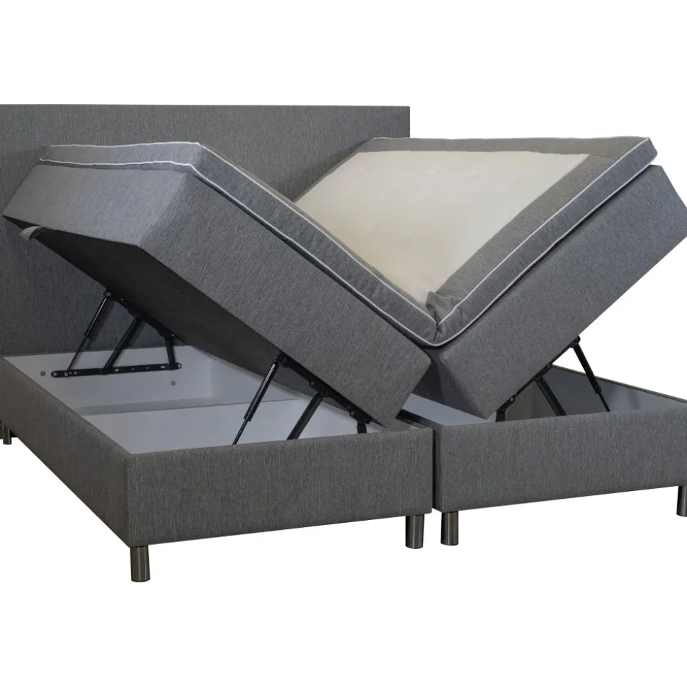 Inkluderat i Accent säng med förvaring: 2 st sängar med sängstomme, resårmadrasser, bäddmadrasser och 8 stycken aluminiumben. Matchande sänggavel finns som tillval.