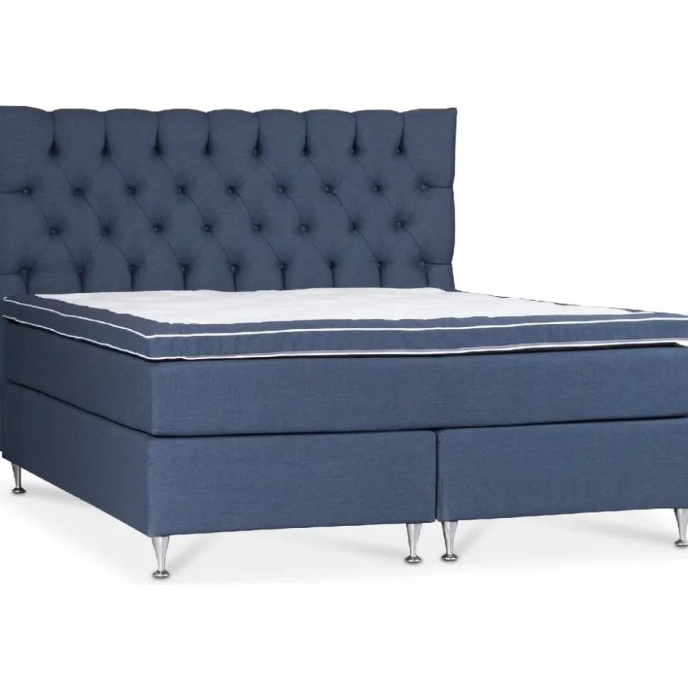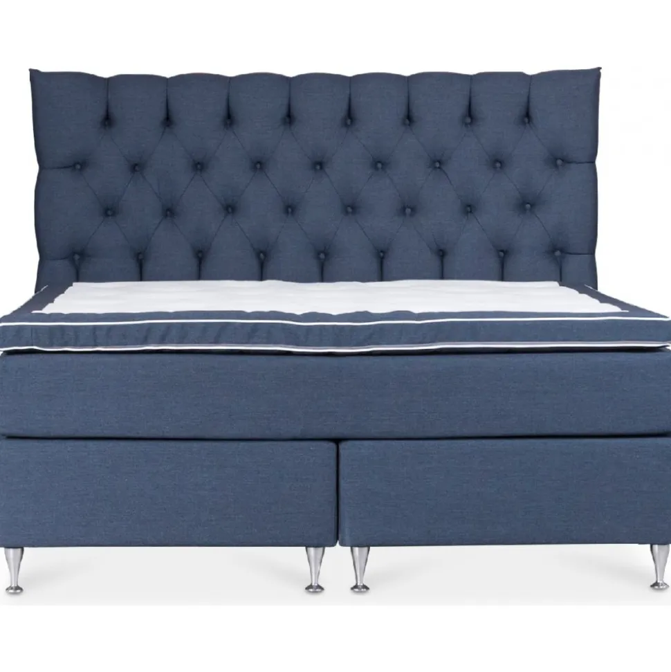 Till sängen ingår en exklusiv, pikerad sänggavel Presley, klädd i det klassiska navyblå tyget Inari 80. Den stilrena gaveln, tillsammans med de champagneformade aluminiumbenen, ger sängen ett elegant och tidlöst utseende.