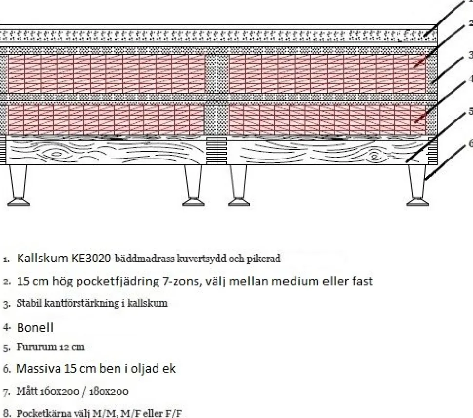 Sängen levereras med en 9 cm hög, mjuk och följsam bäddmadrass med kallskumskärna KE3020. Madrassen är pikerad och försedd med keder runtom för en stilren finish och behaglig känsla.