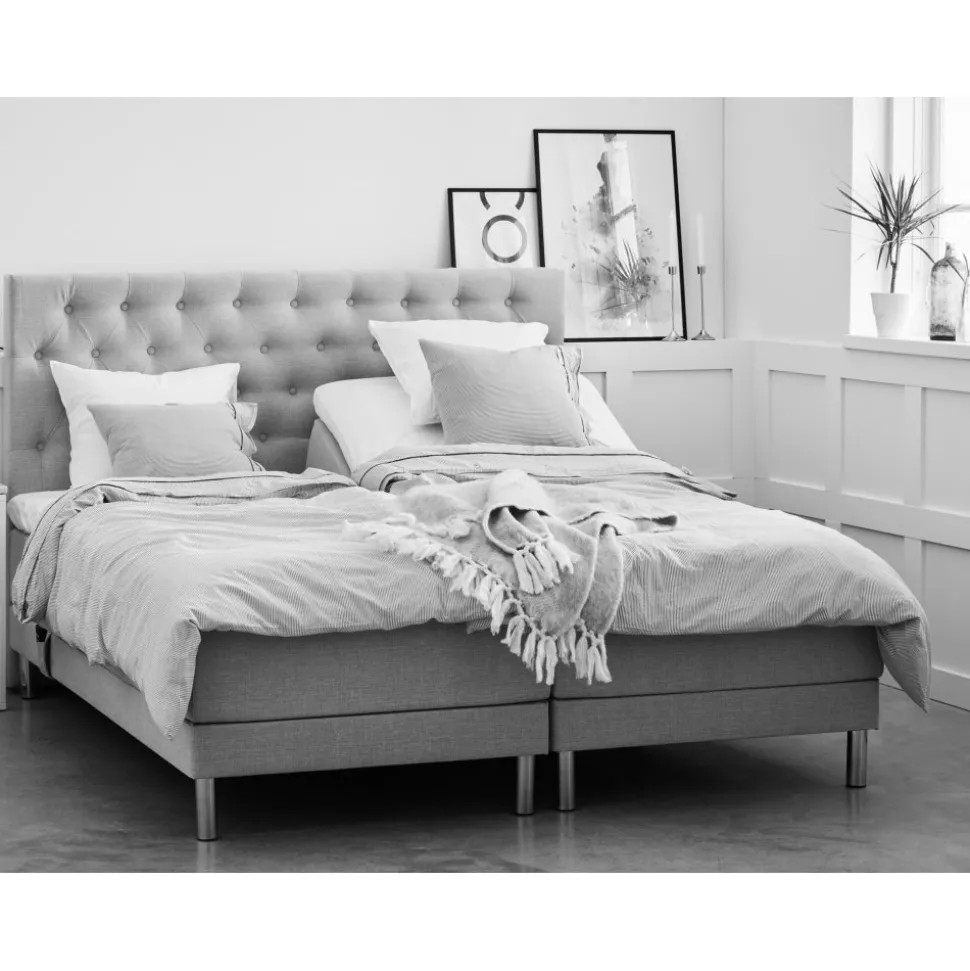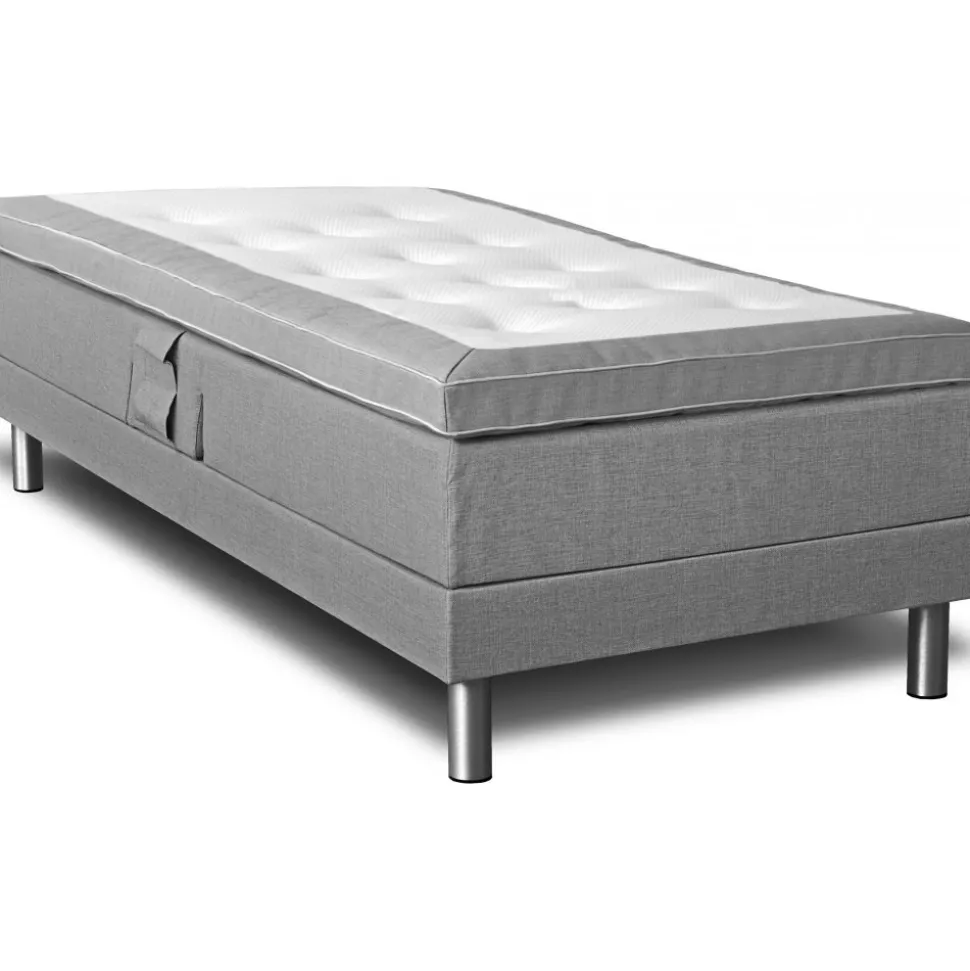 Nova levereras med en lyxig 8 cm hög bäddmadrass. Sängen är klädd i ett grått slitstarkt tyg (Rocco BEJ570).