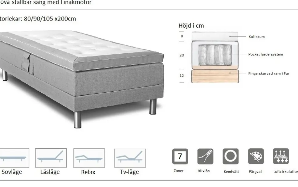 Ställbar motorsäng Nova med en hög kvalitet tackvare Linak motor och kraftig ram. Vi levererar sängen med en lyxig, pikerad och skön bäddmadrass i kallskum HR3030. Inbyggda luftkanaler i bäddmadrassen ger cirkulation och en bättre sömn. Sängen har ett följsamt 7-zons pocket fjädersystem som ger en skön comfort för kroppen. Den fingerskarvade bottenramen är 12 cm hög och byggd i europaproducerad fur.