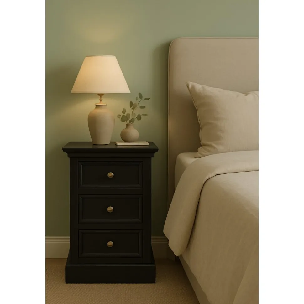 Sängbord Bristol i svart med 3 lådor är en utmärkt kombination av funktionalitet och stil. Ytskiktet på möbeln är behandlat för att ge ett vintage uttryck och har således lite märken och små skavanker. Färgskiftningar, märken, lagningar och småsprickor hör till dess unika utseende. Med sitt vintageinspirerade ytskikt ger Holmby en charmig och karaktärsfull känsla som passar perfekt i både moderna och traditionella sovrum.