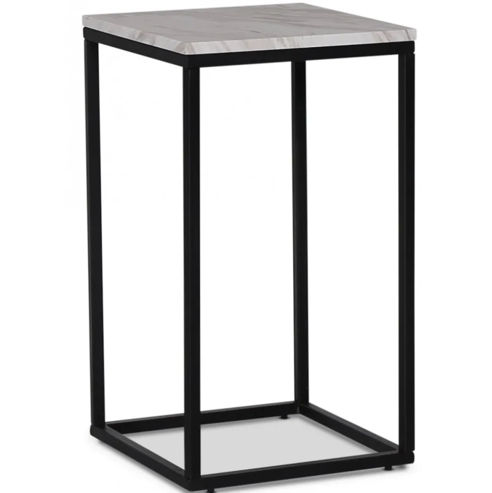 Sängbord med toppskiva i ljus marmorimitation (MDF) med underrede i svartlackad metall. Ett stiligt och prisvärt med tålig och slitstark yta.