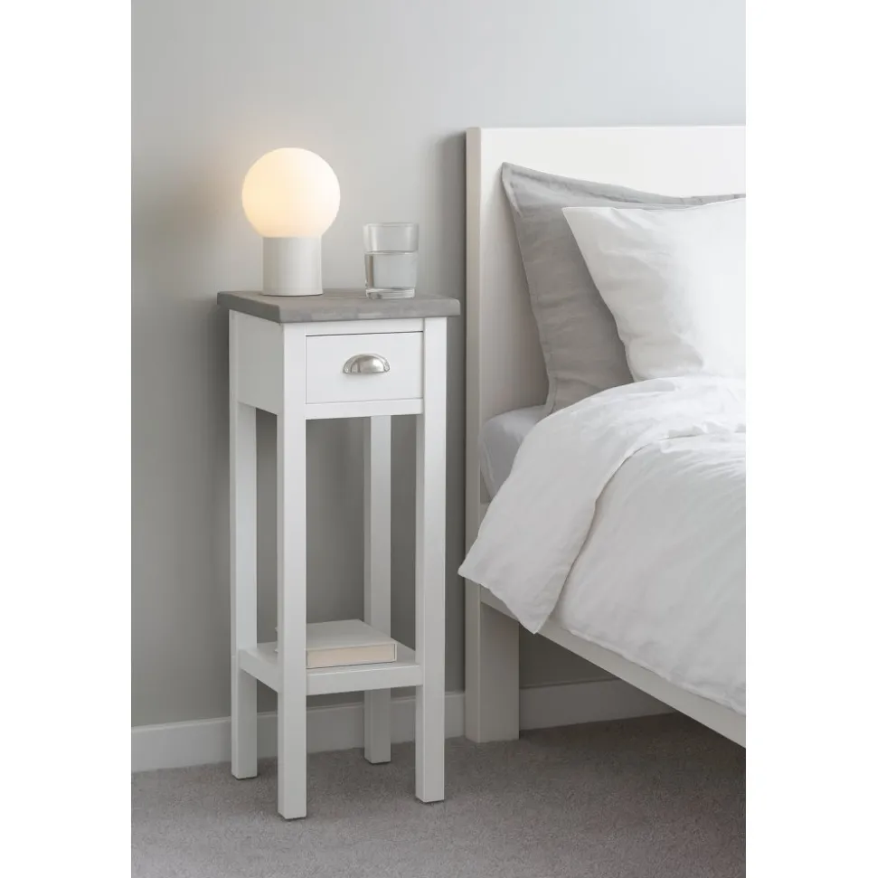 Sängbordet erbjuder praktisk förvaring med en låda, vilket är en perfekt plats för att lägga undan din bok eller andra personliga föremål i.