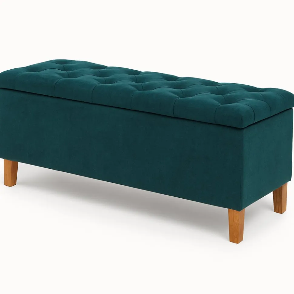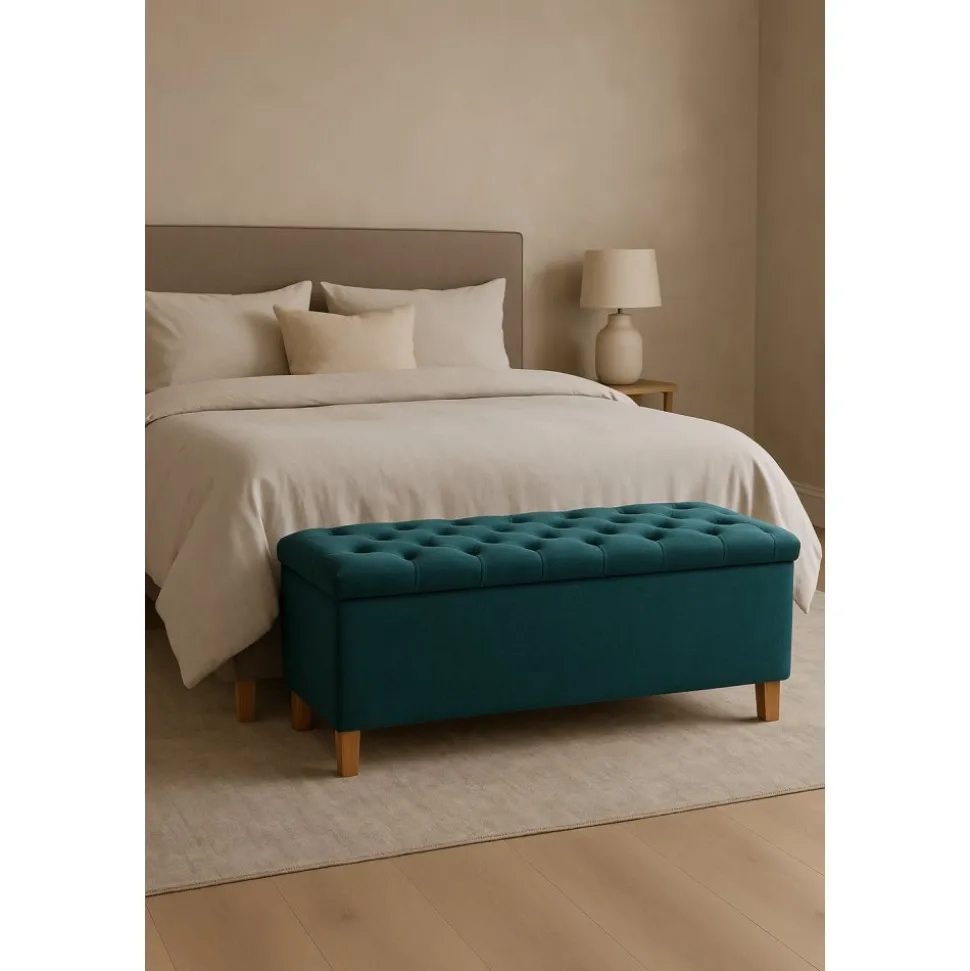 Ge sovrummet en stilren och funktionell detalj med denna eleganta sängkista. Den vadderade sitsen med dekorativa knappar ger ett exklusivt intryck och fungerar lika bra som som extra förvaringsutrymme.