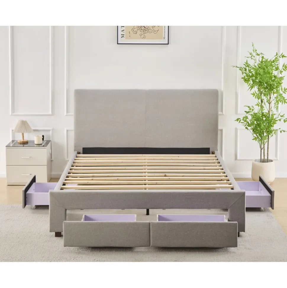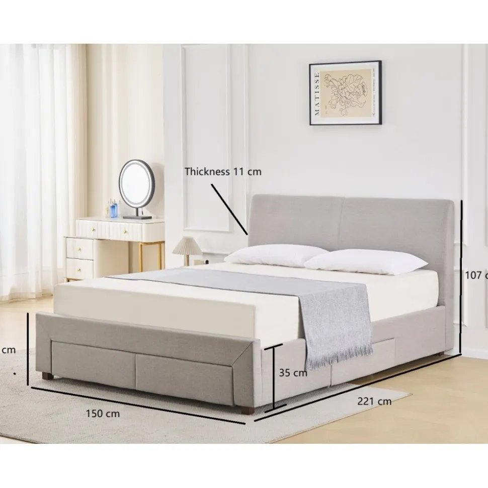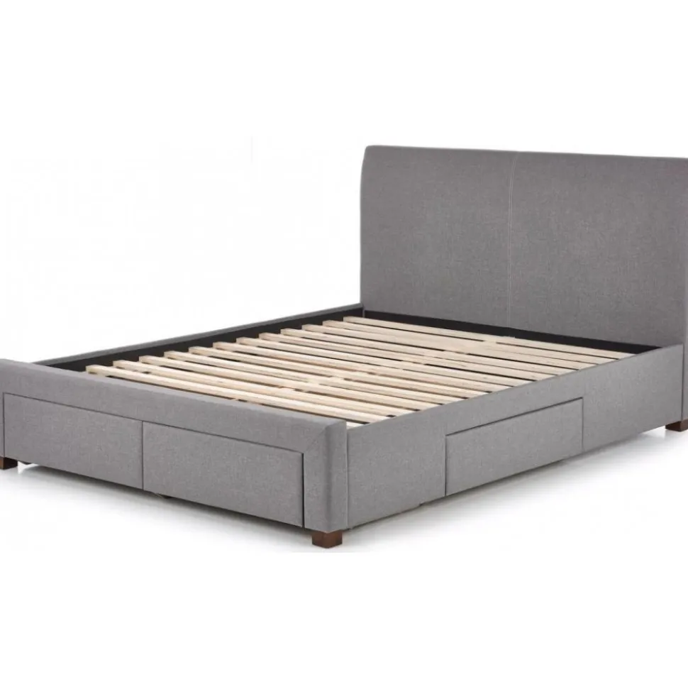 Vaxö inklusive sänggavel och bra förvaring i de inbyggda lådorna i sängramen. Smarta förvaringslådor där täcken och kuddar kan förvaras. Sängramen är klädd i ett grått tyg.