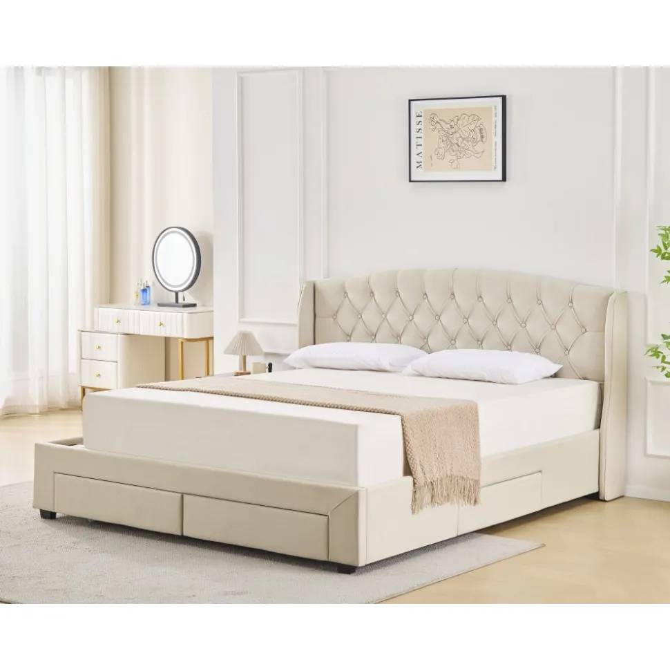 Lady med sänggavel och förvaring. Praktisk förvarinsglådor finns inbyggda i sängramen. Komplett med arbetad och detaljrik sänggavel med knappar. Beige mjukt tyg.