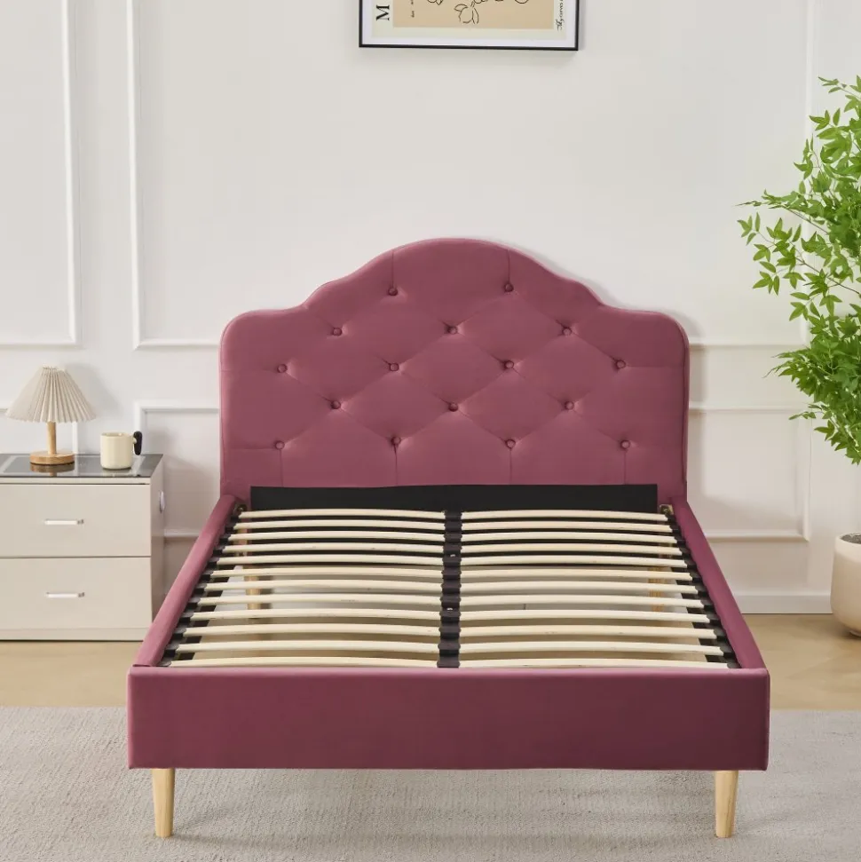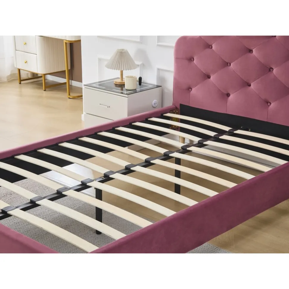 Lemings med ben av trä. Ribb-botten av plywood. Rosa mjukt tyg på både ram och sänggavel.