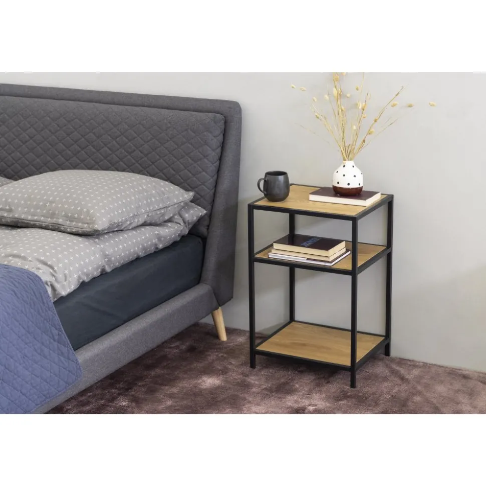 Sängbord med ben av pulverlackerad metall. Bordsskiva av dekorpapper och MDF.