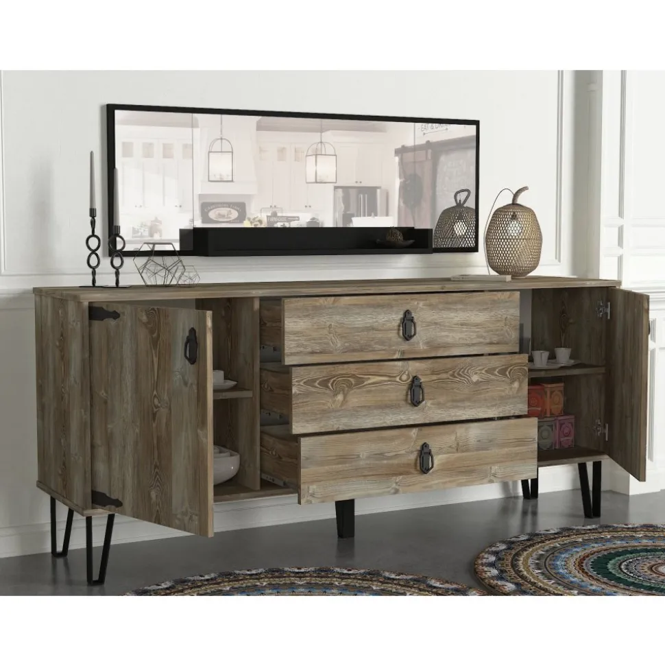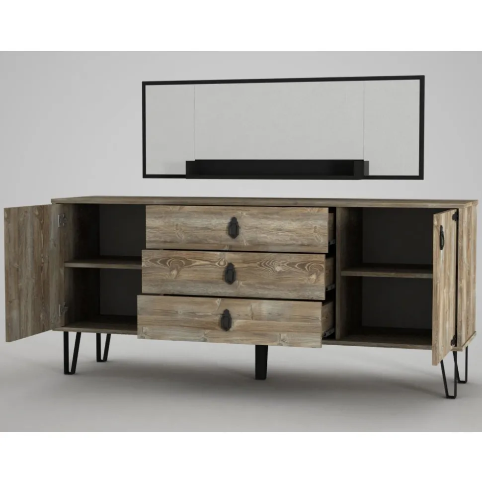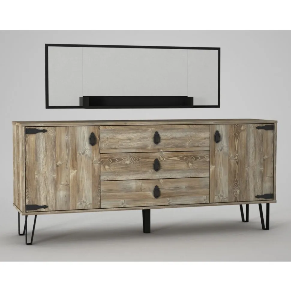Skänk av melaminbelagd spånskiva. Ben av metall.