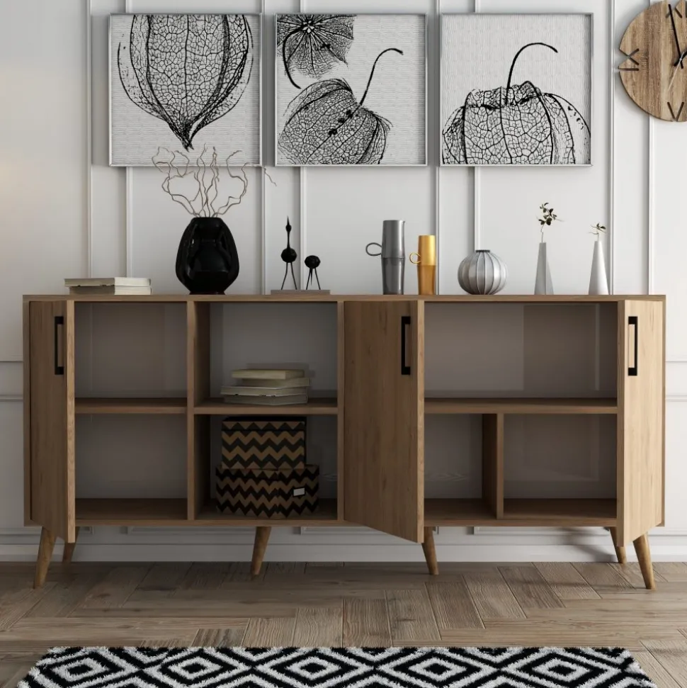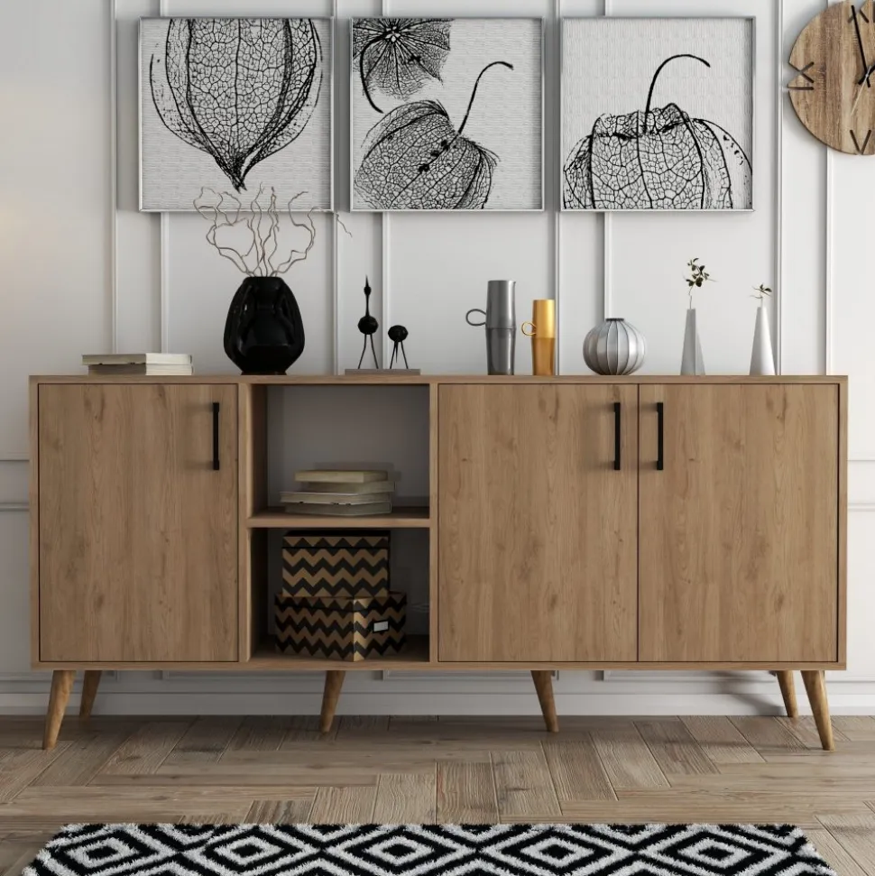 Retro skänk med goda förvaringsmöjligheter. Både genom dold förvaring bakom de tre luckorna på skänkens framsida och även i den öppna förvaringen med hyllplan. Skänken är tillverkad i melaminbelagd spånskiva i ekutförande.