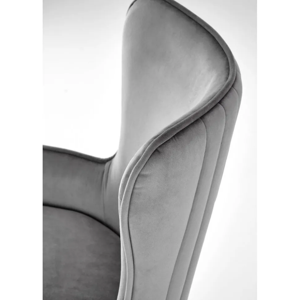 Fåtölj med underrede av metall och klädsel av sammetstyg.