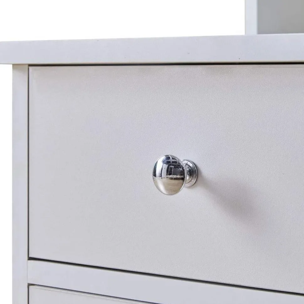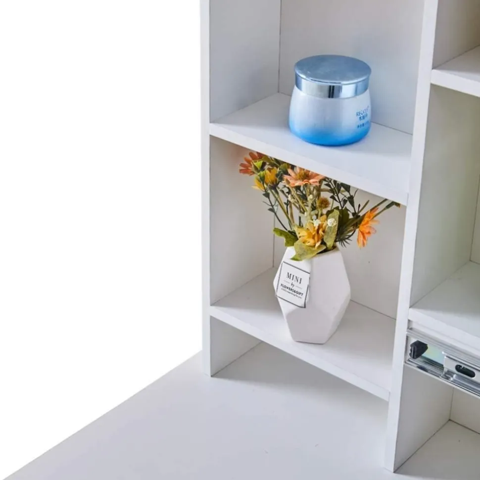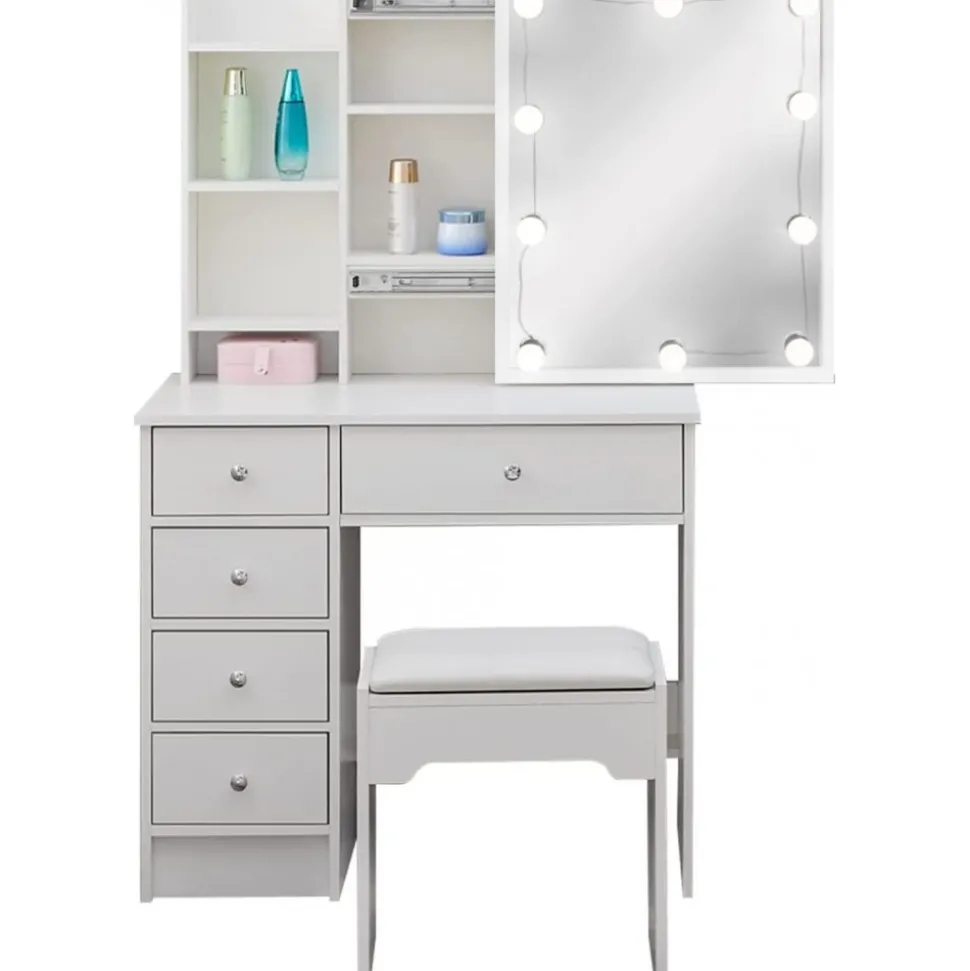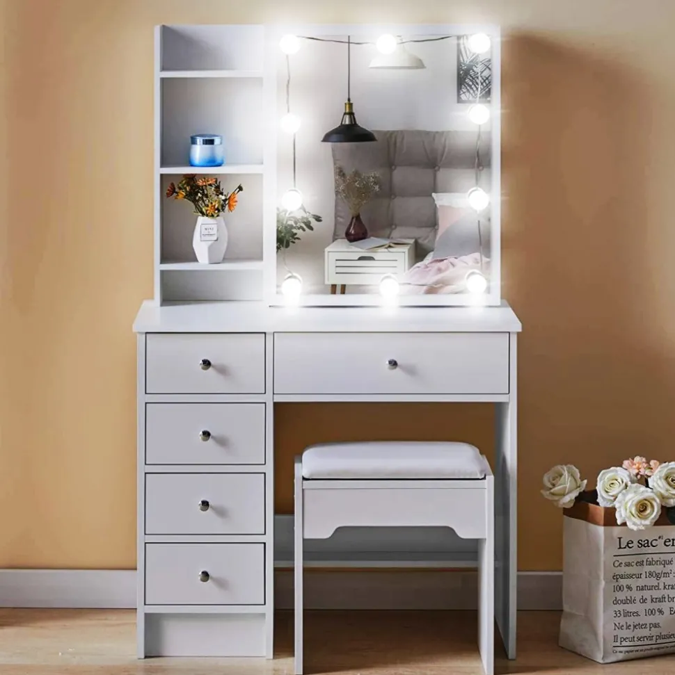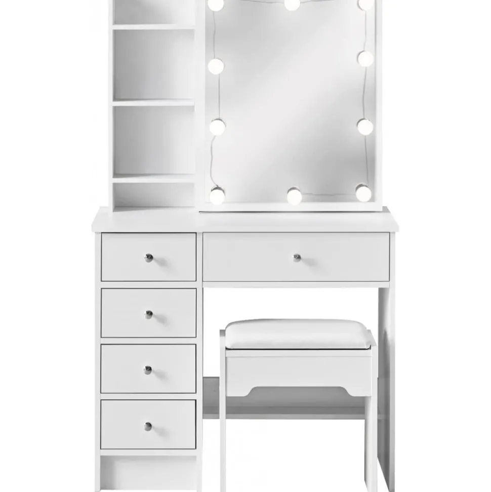 Vitt Sminkbord av trä med 10st LED-lampor som ger ett klart och justerbart ljus, så att du enkelt kan se varje detalj när du sminkar dig. Upplev det ultimata i skönhet och funktionalitet med vårt vita eleganta av trä, designat för att ge dig den perfekta platsen att skapa din look. Oavsett om du förbereder dig för en utekväll eller bara vill se bra ut till vardags, kommer detta sminkbord att bli ditt bästa vän.