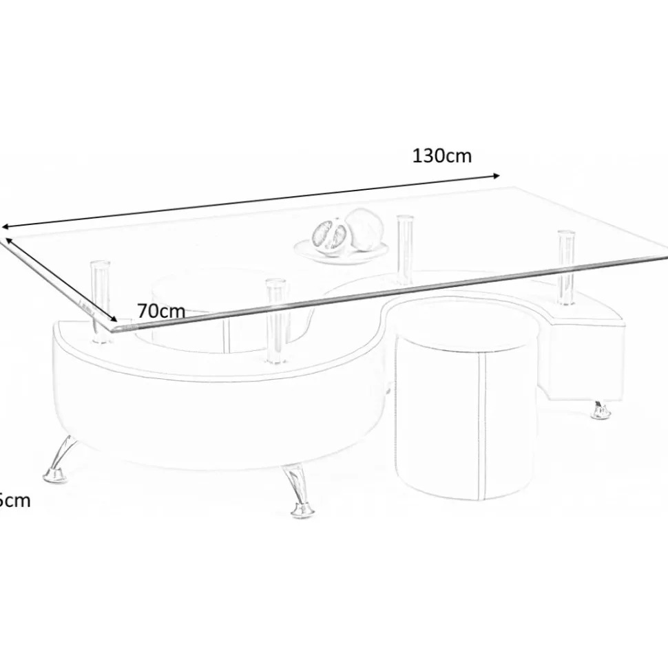 Ett mysigt med sittpuffar. Bordets stomme och sittpuffarna är tillverkade i MFP (premium träskiva) med en härligt vit klädsel i konstläder. Bordsskivan är i klarglas med detaljer i kromad metall och stommen är med klädd i ett vitt konstläder. Puffarna kan placeras på ett mycket platseffektivt sätt under bordet för att spara på yta. Bordet passar perfekt in på flera olika platser i hushållet.