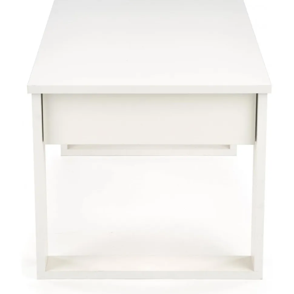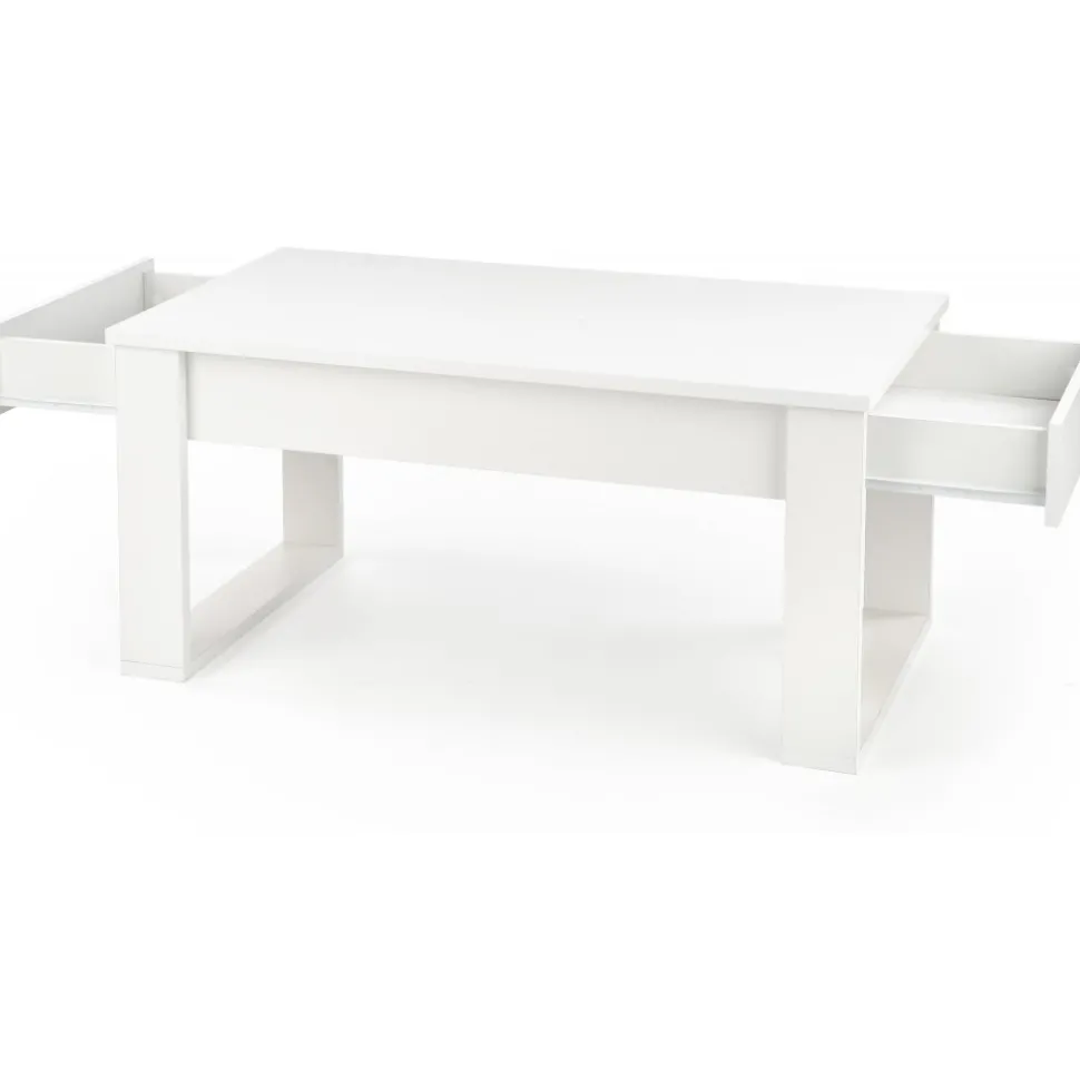 Soffbord i vit laminerad spånskiva. Soffbordet har även två förvaringslådor på soffbordets kortsidor.