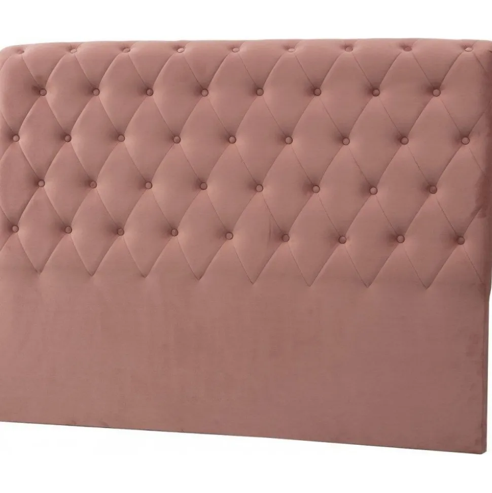 Sänggavel av trä med klädsel av tyg och stoppning av skum.