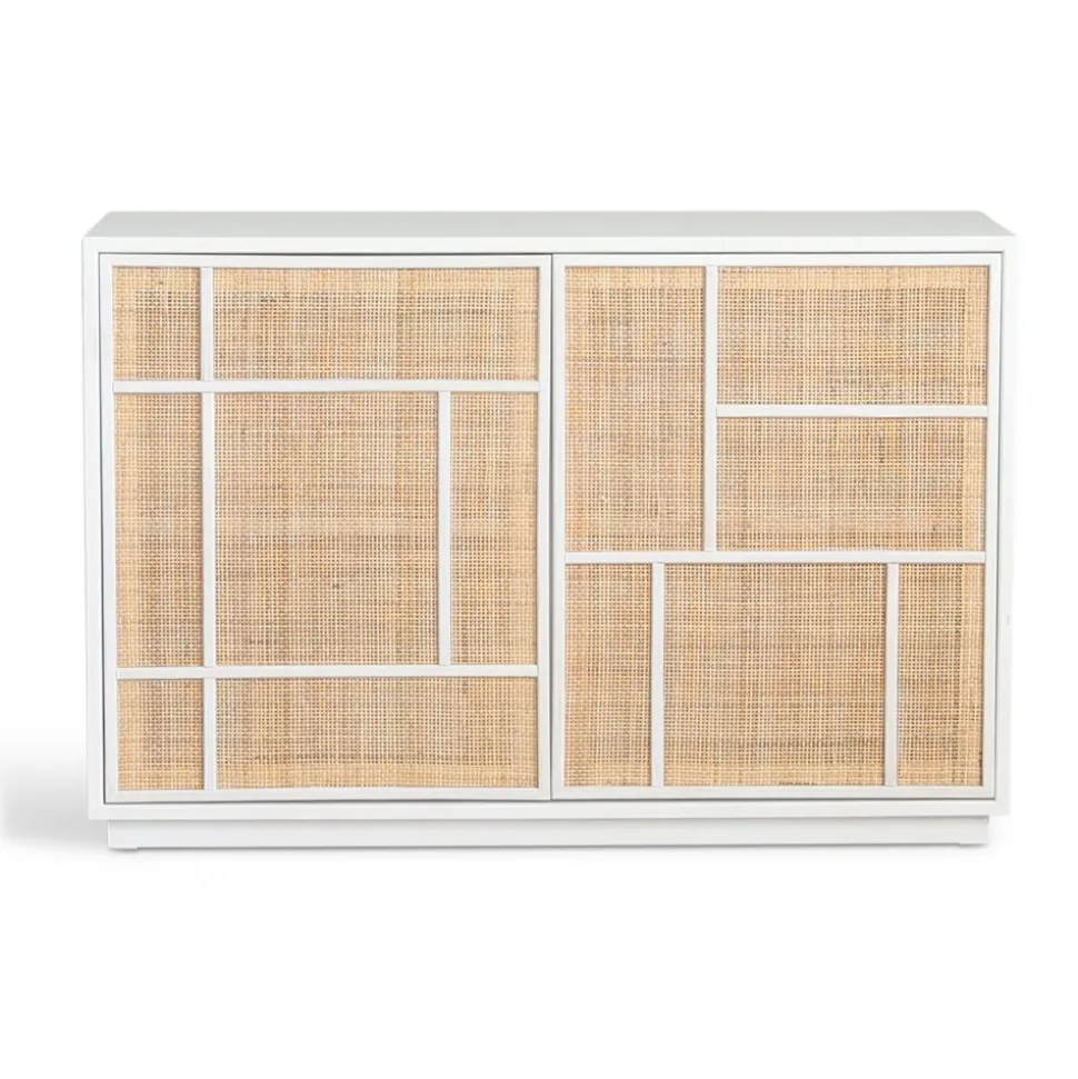 Stockholm sideboardet i vitt trä med fronter i ljus rotting. Sideboardet innehåller två fasta hyllplan. Detta har bra förvaringsmöjligheter.