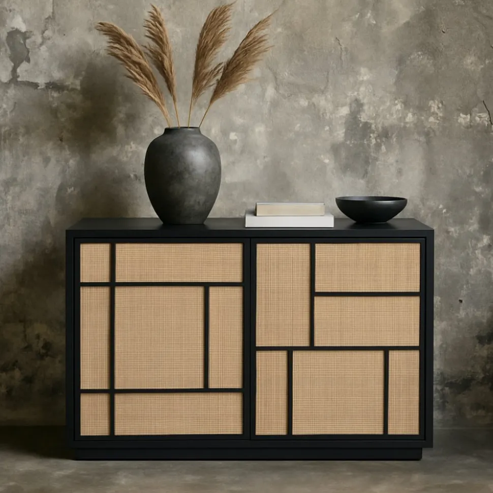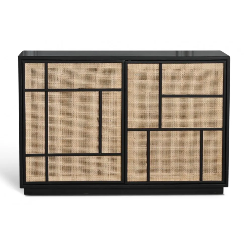 Stockholm i svartlackat trä med fronter i rotting. Sideboardet har två hyllor. Detta sideboard har bra förvaringsmöjligheter och en trendig design.
