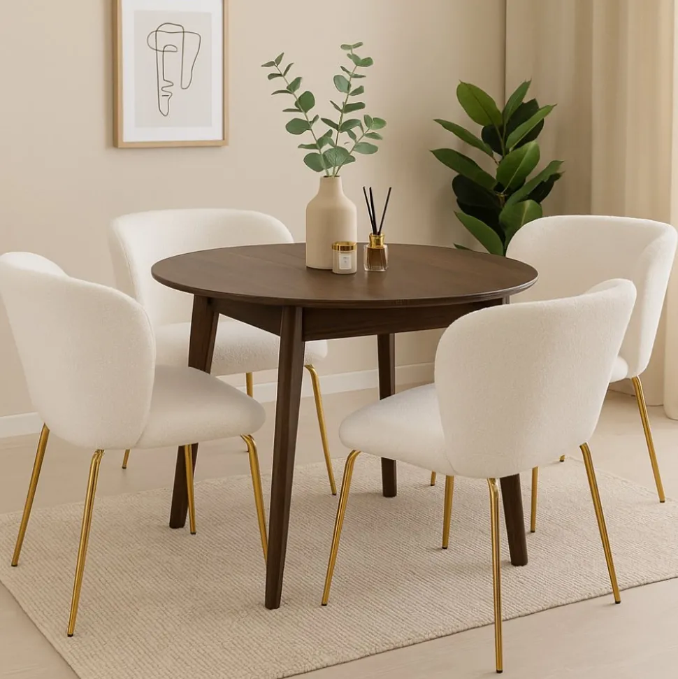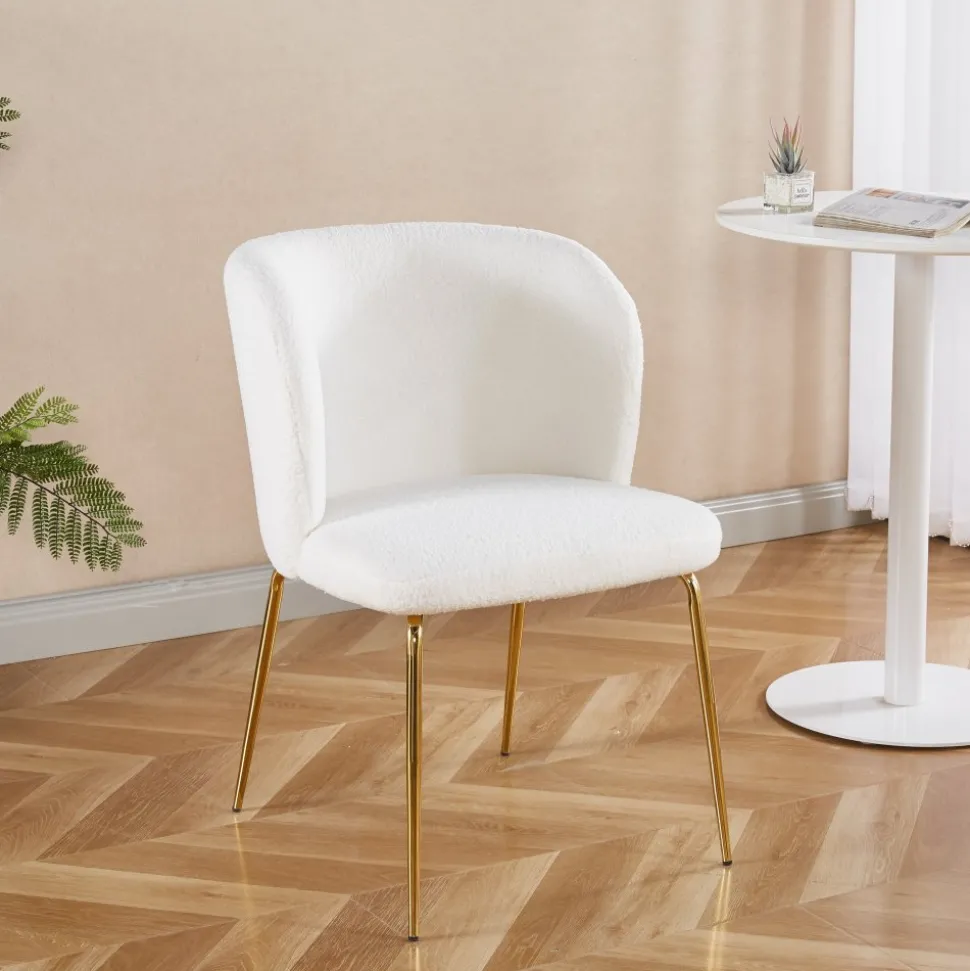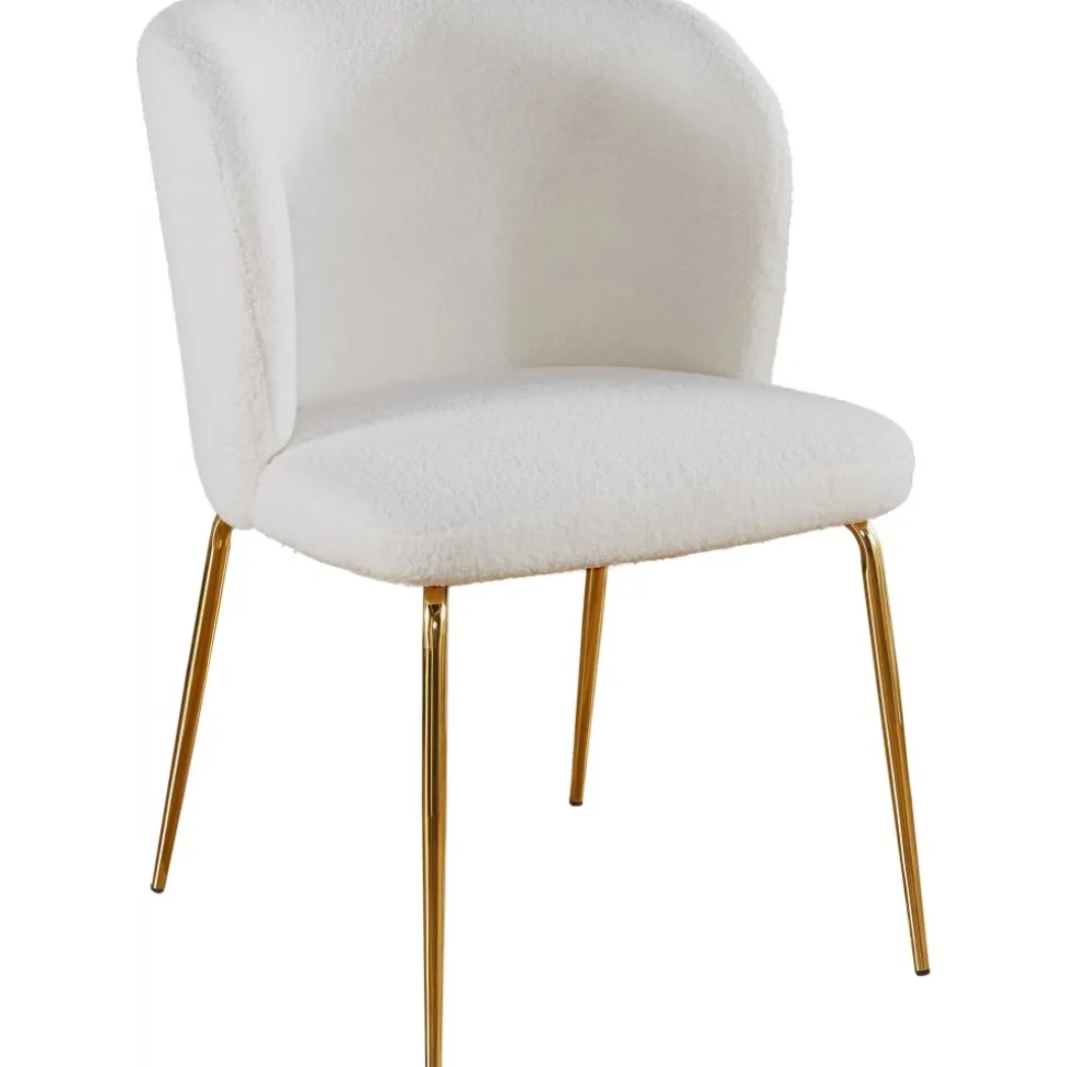 Matstol med klädsel av boucletyg. Underrede i mässingsutförande.