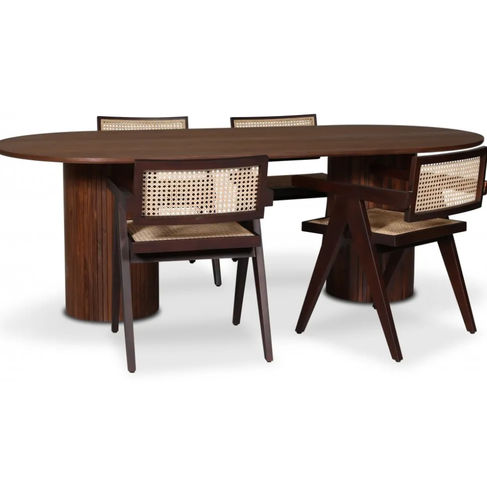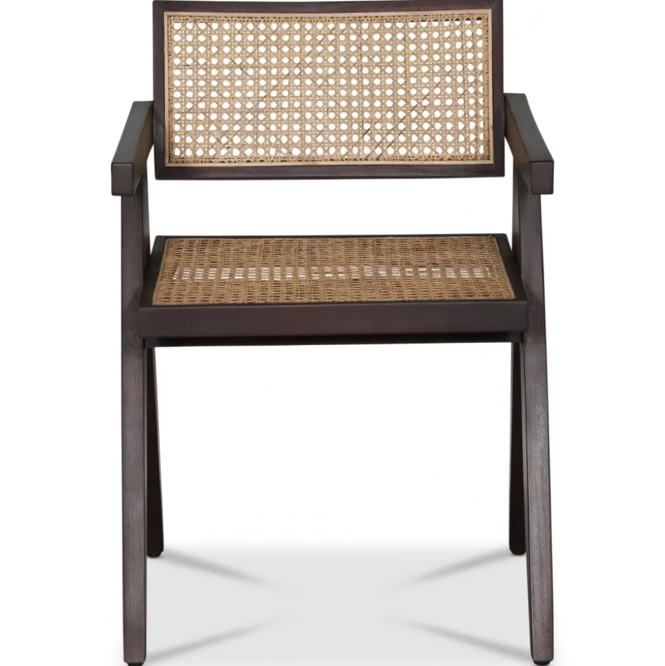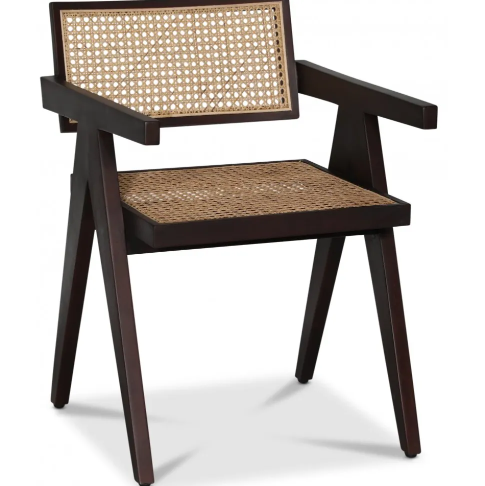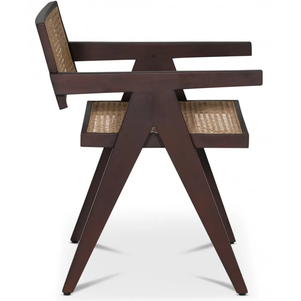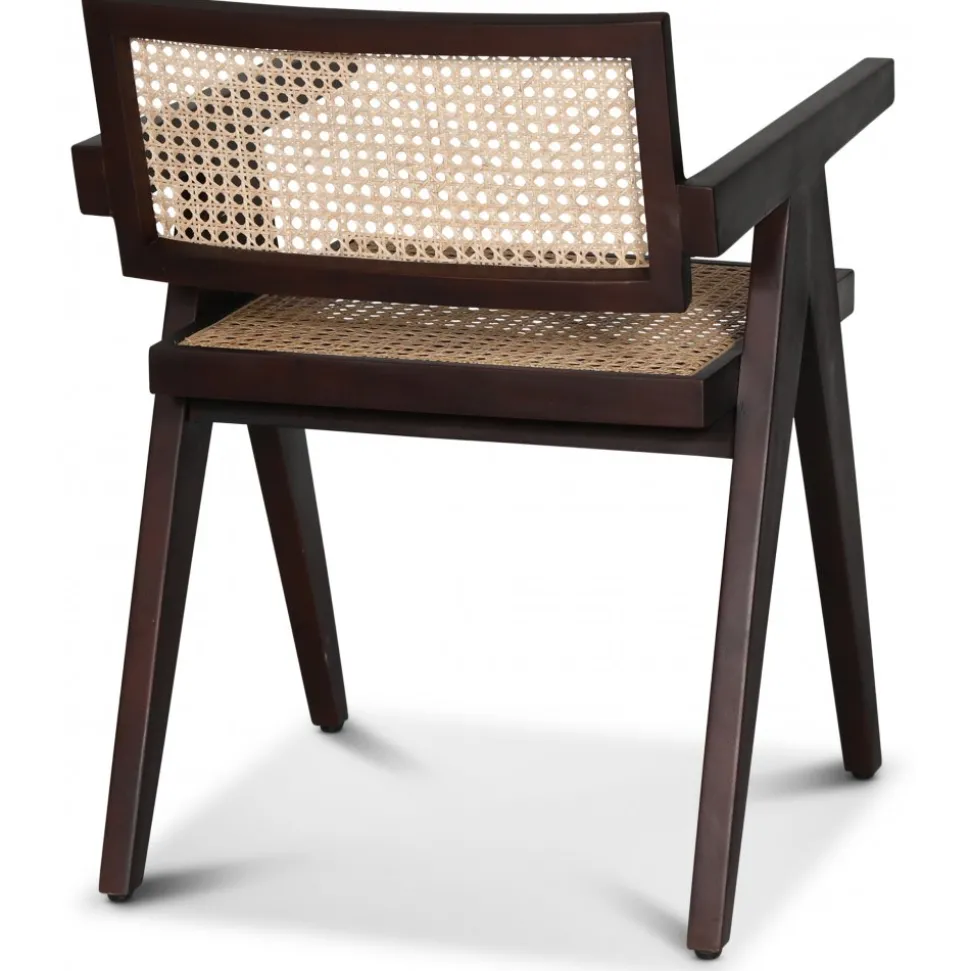 Karmstol med stomme av exklsuiv mahogny i brunt, ryggstöd- och sits av naturfärgad rotting.