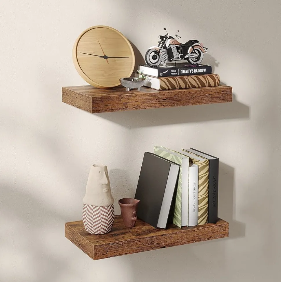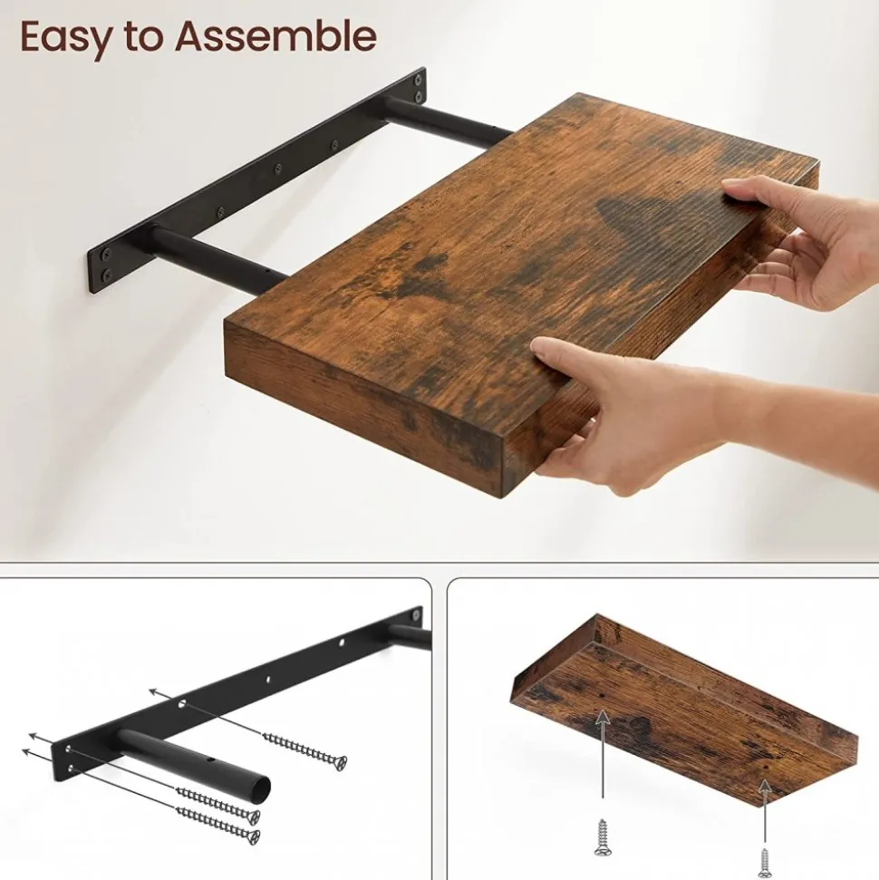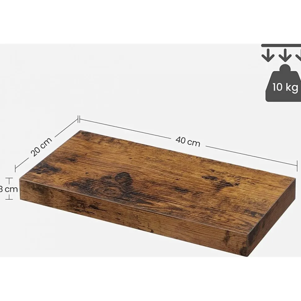 Vägghylla av trä med konsol av järn.