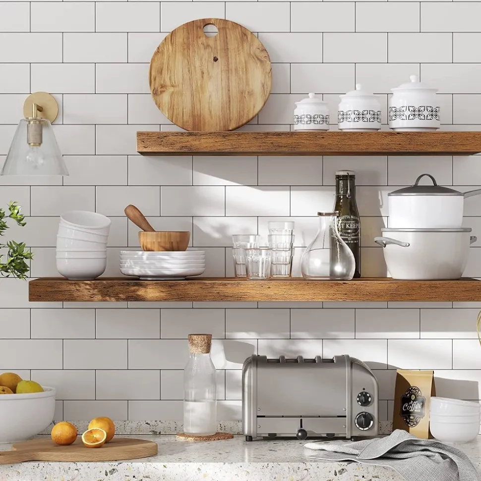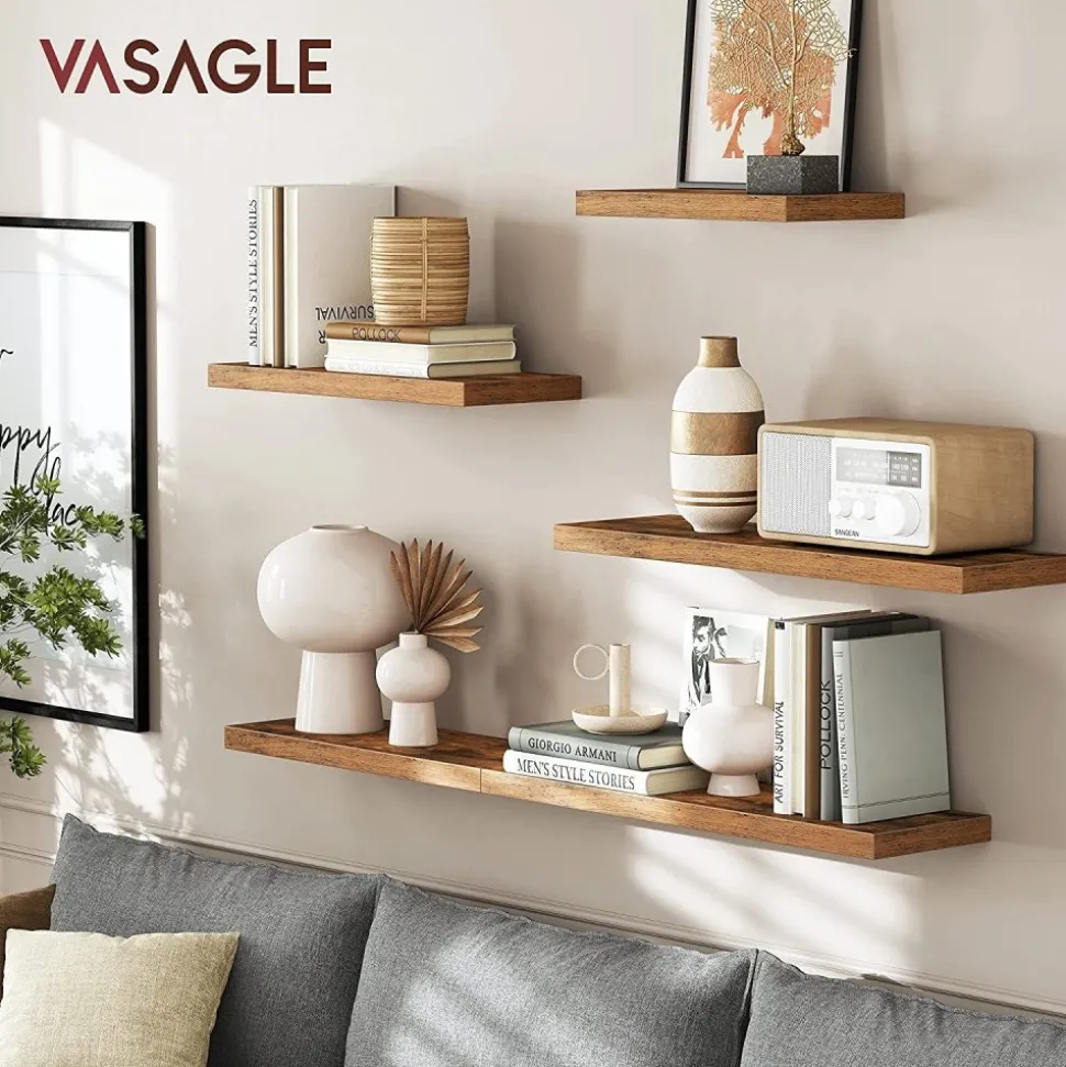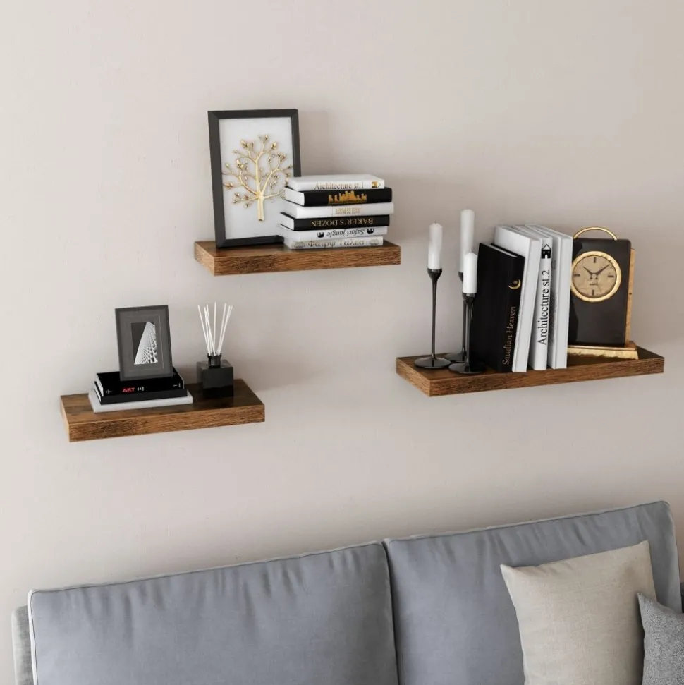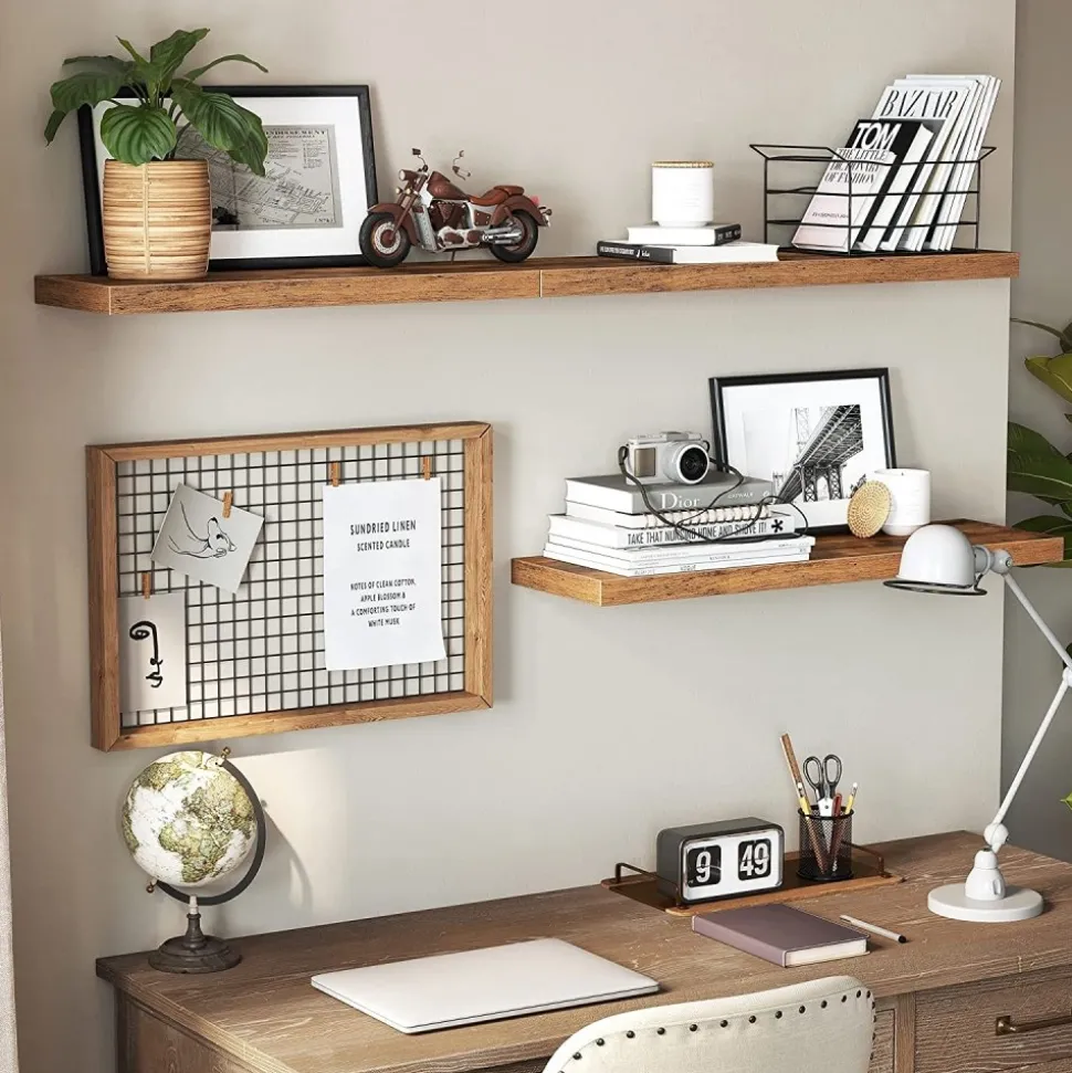 Vägghylla av trä med konsol av järn.