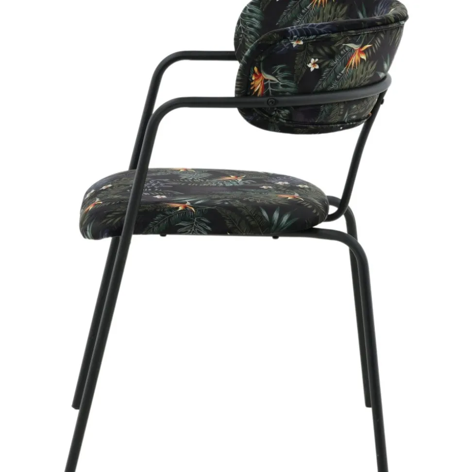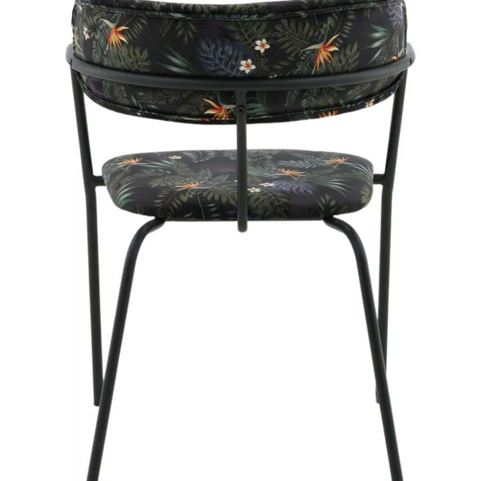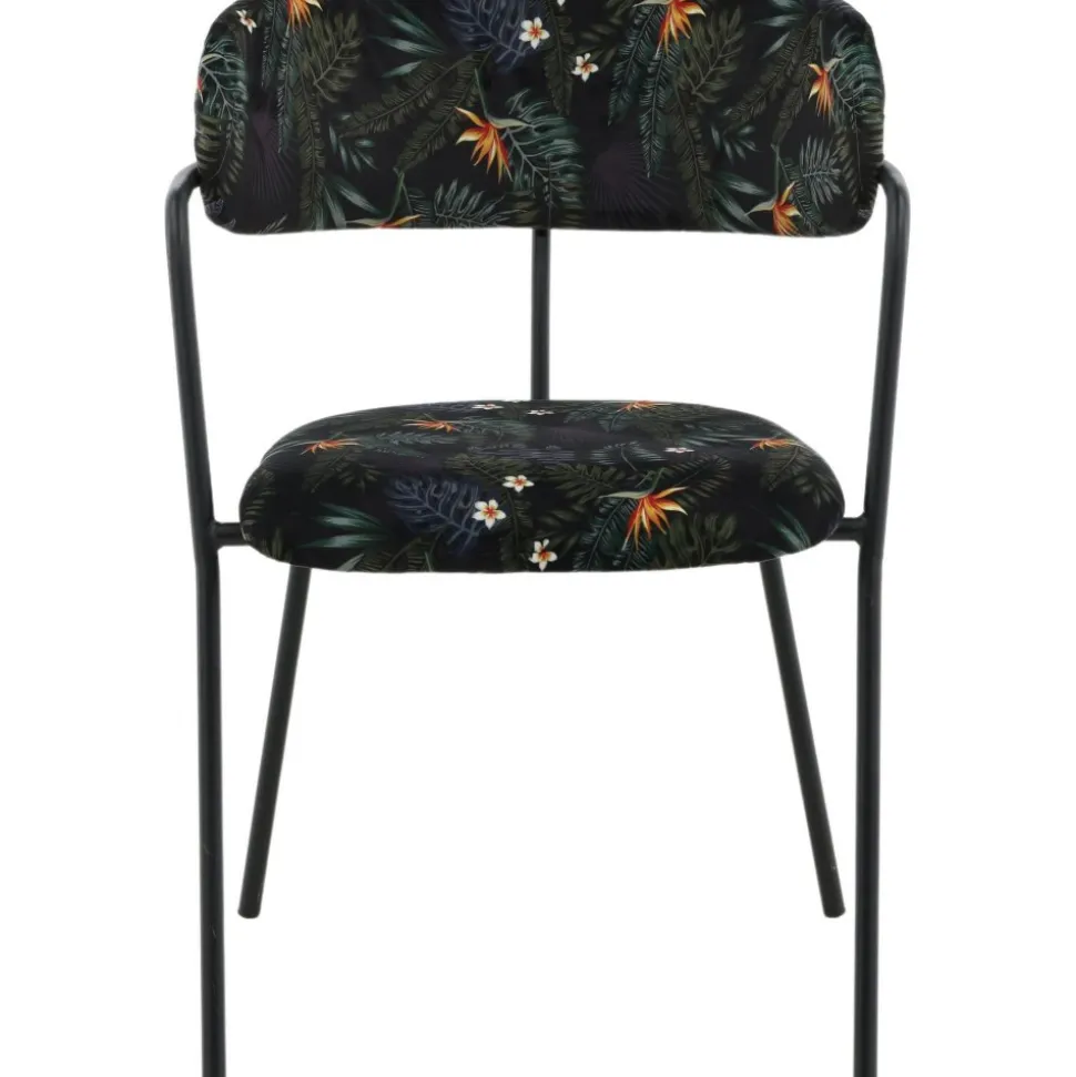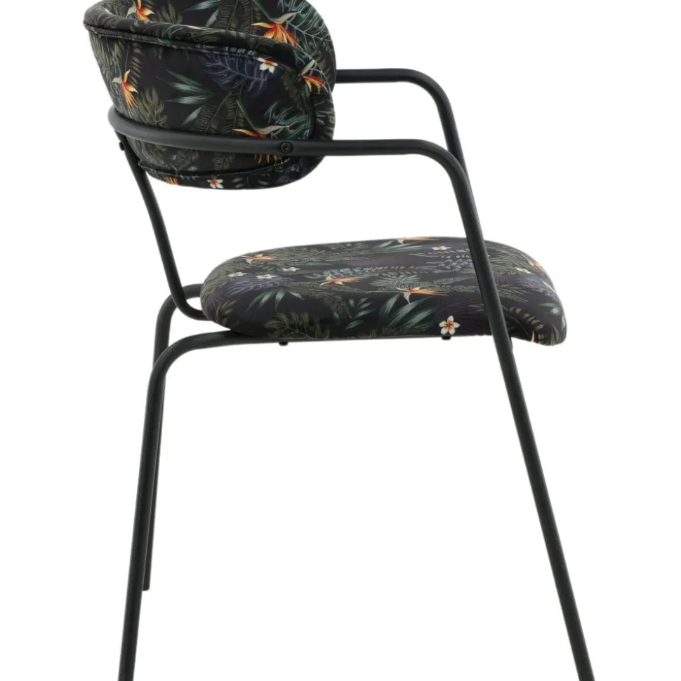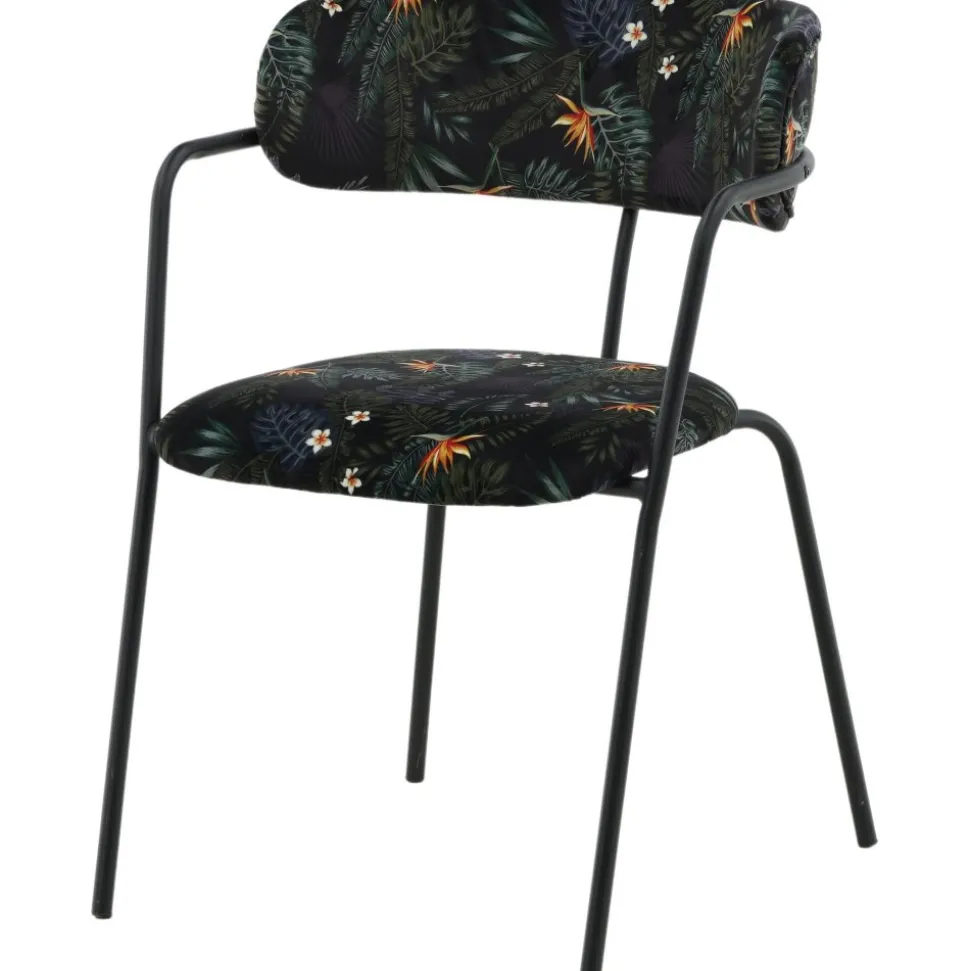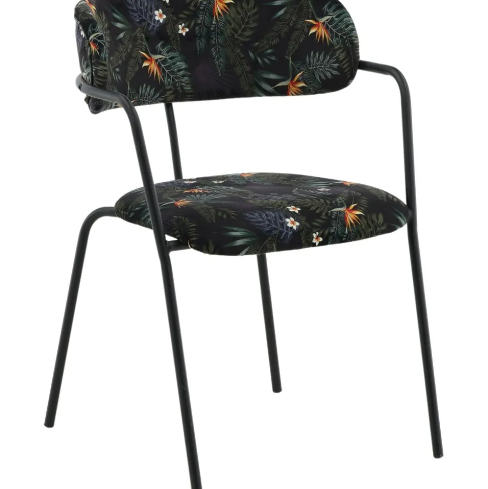 Karmstol av metall och plywood, klädd med polyestertyg.