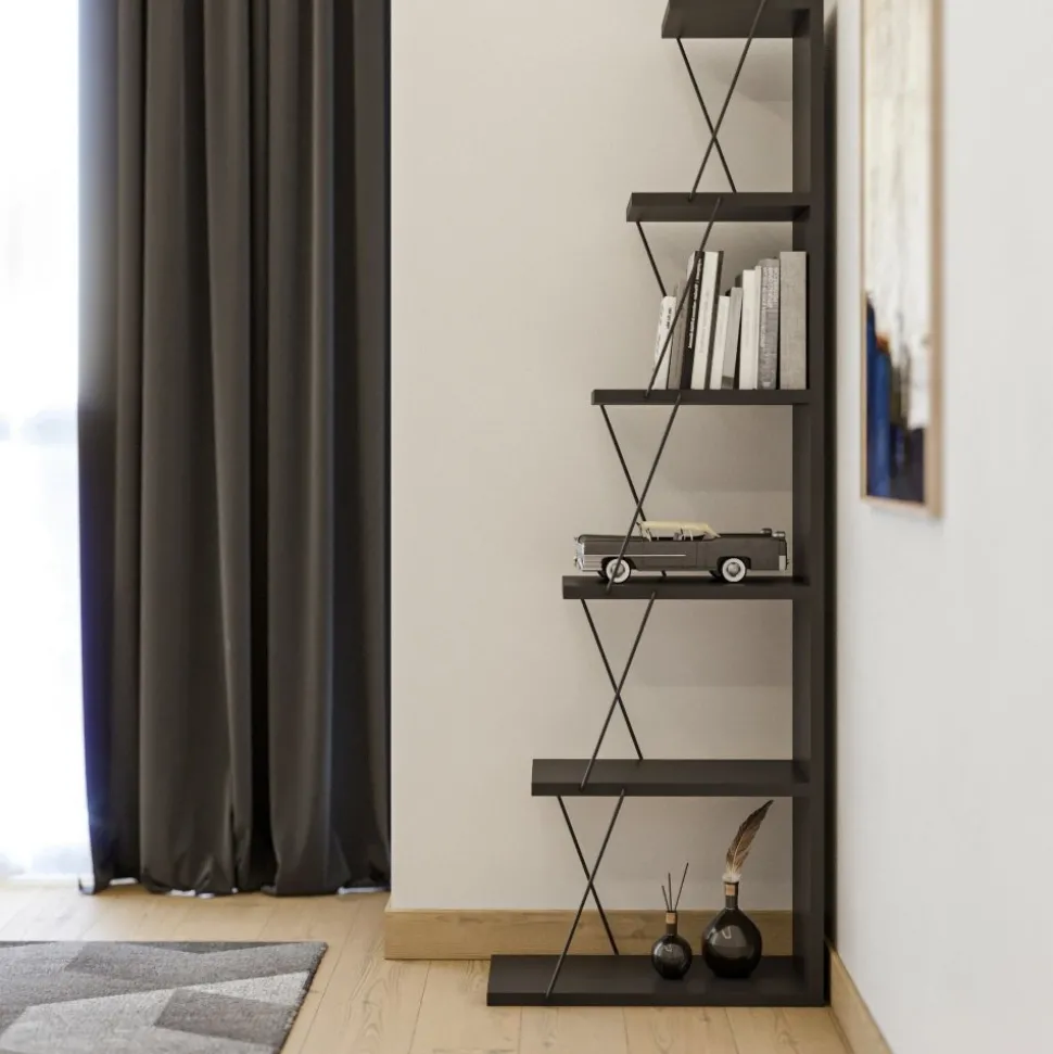Bokhylla av trä och metall.
