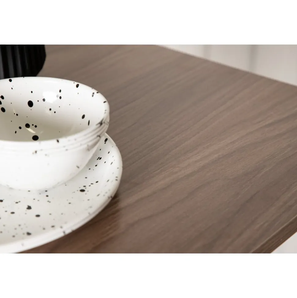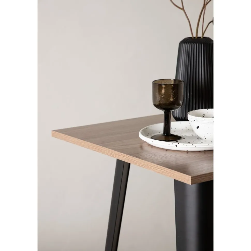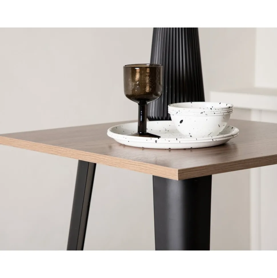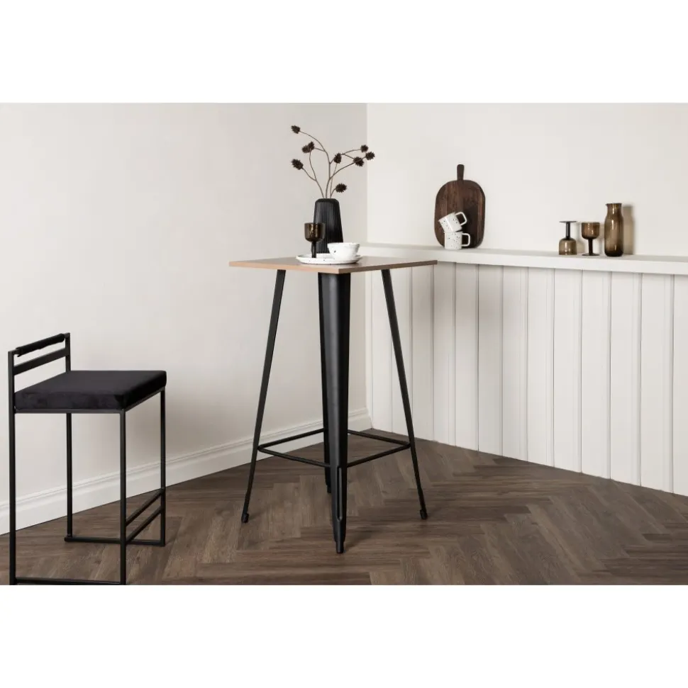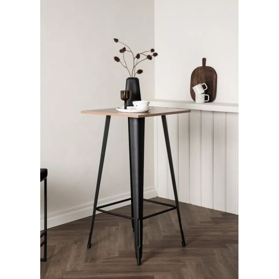 Barbordet med nätt storlek som gör att det lämpar sig utmärkt i det mindre köket eller som sidobord i vardagsrummet. Bordet har en kvadratisk bordsskiva i valnötsfärgad MDF och lätt utsvängda bordsben i svart metall med en ram till fotstöd för extra komfort. Matcha med ett par läckra barstolar och ge hemmets hjärta ett lyft!