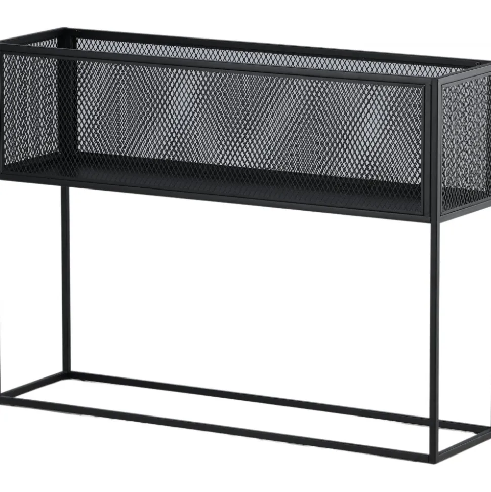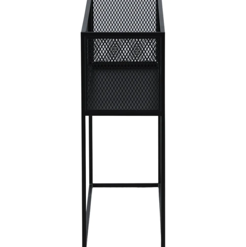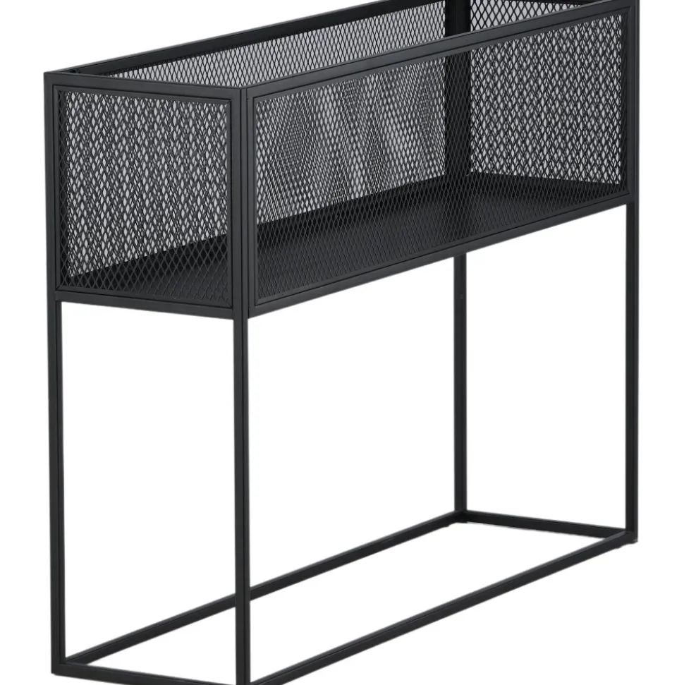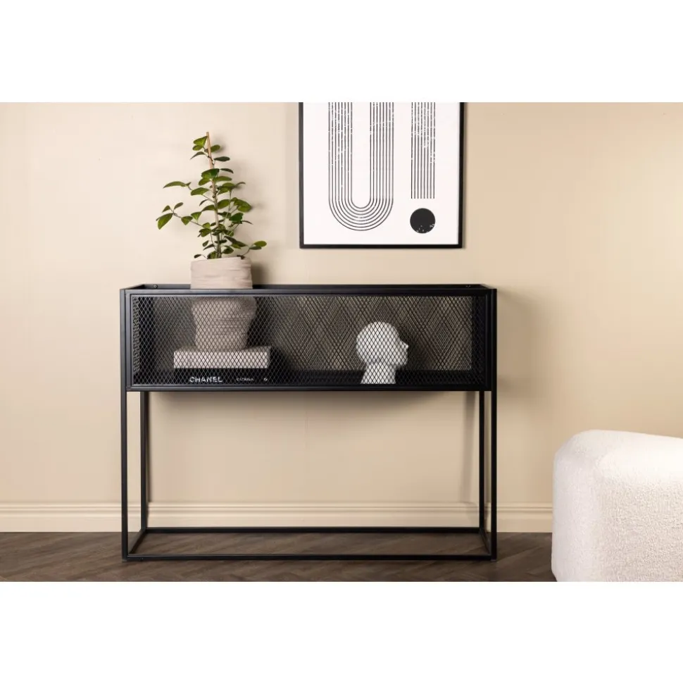 Möblera hemmet modernt och smart med hjälp av Teo avlastningshylla. Det här läckra sidobordet/hyllan har en smäcker industriell design med ett hyllplan för förvaring, nätsidor omkring hela förvaringsytan och smala höga ben i svart stål. Skåpets smidiga storlek och eleganta utsida gör den lättplacerad och passar bra in i de flesta rum i hemmet, så möblera efter egna behov och önskemål och pryd med vackra dekorationer, blommor eller annat som måste förvaras – bara fantasin sätter gränser.