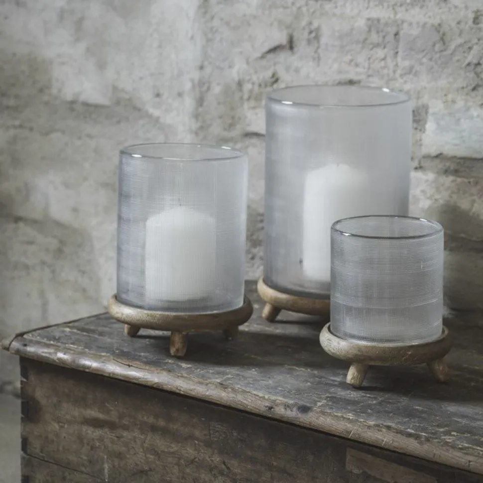 Ljuslykta/vas i glas med hel botten som står på en bricka med ben i mangoträ.