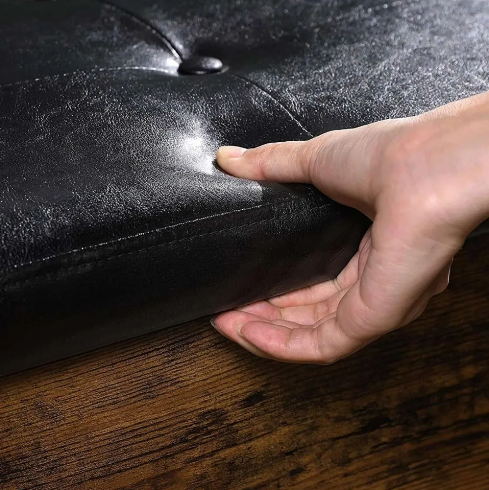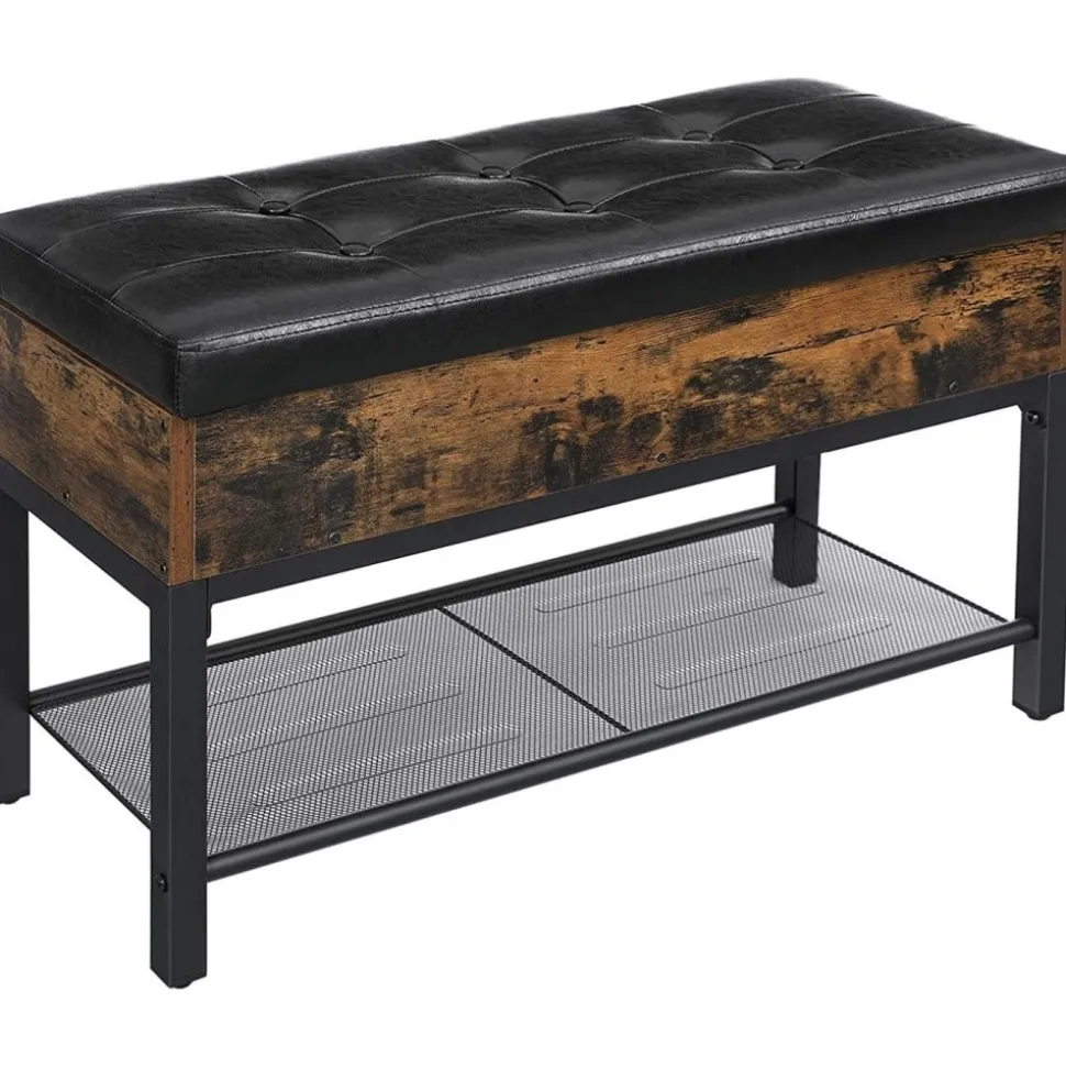 Tomas hallbänk kombinerar en stabil stomme av svart stål med en sits i trä, klädd i slitstarkt konstläder. Den svartbruna färgkombinationen ger ett modernt och elegant uttryck som passar i de flesta hem.