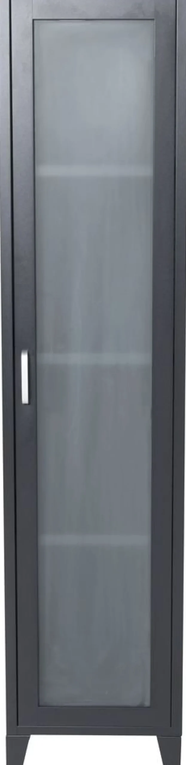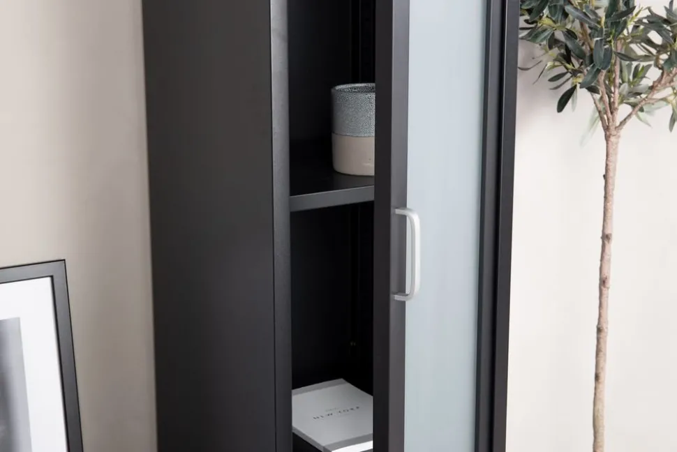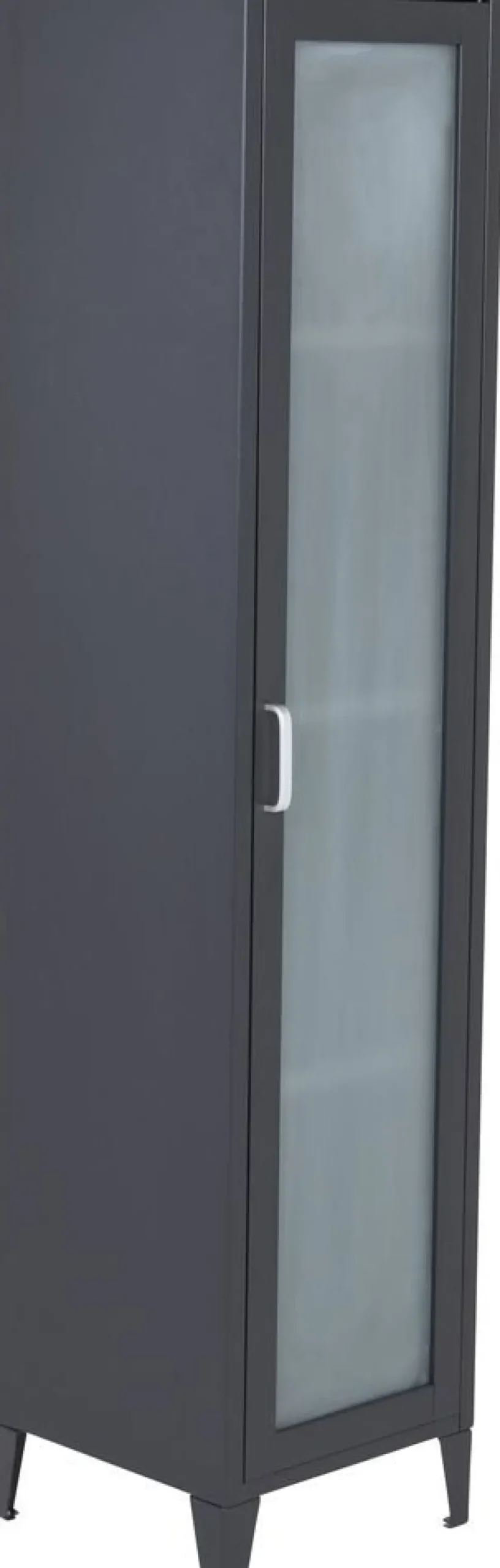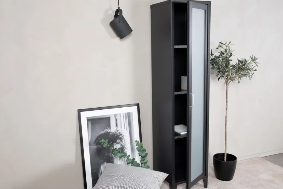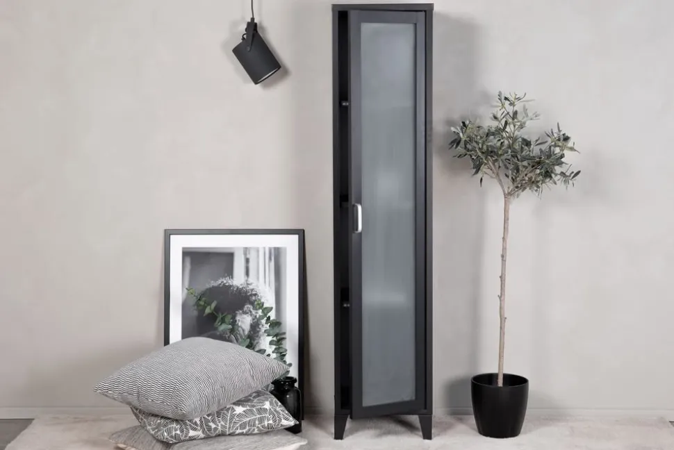 Torpa är en serie och sideboards i olika färger. Tillverkade av metall som pulverlackerats för ett stilrent uttryck. Detta skåp har mjölkfärgat glas i dörrarna och ett metallfärgat handtag.