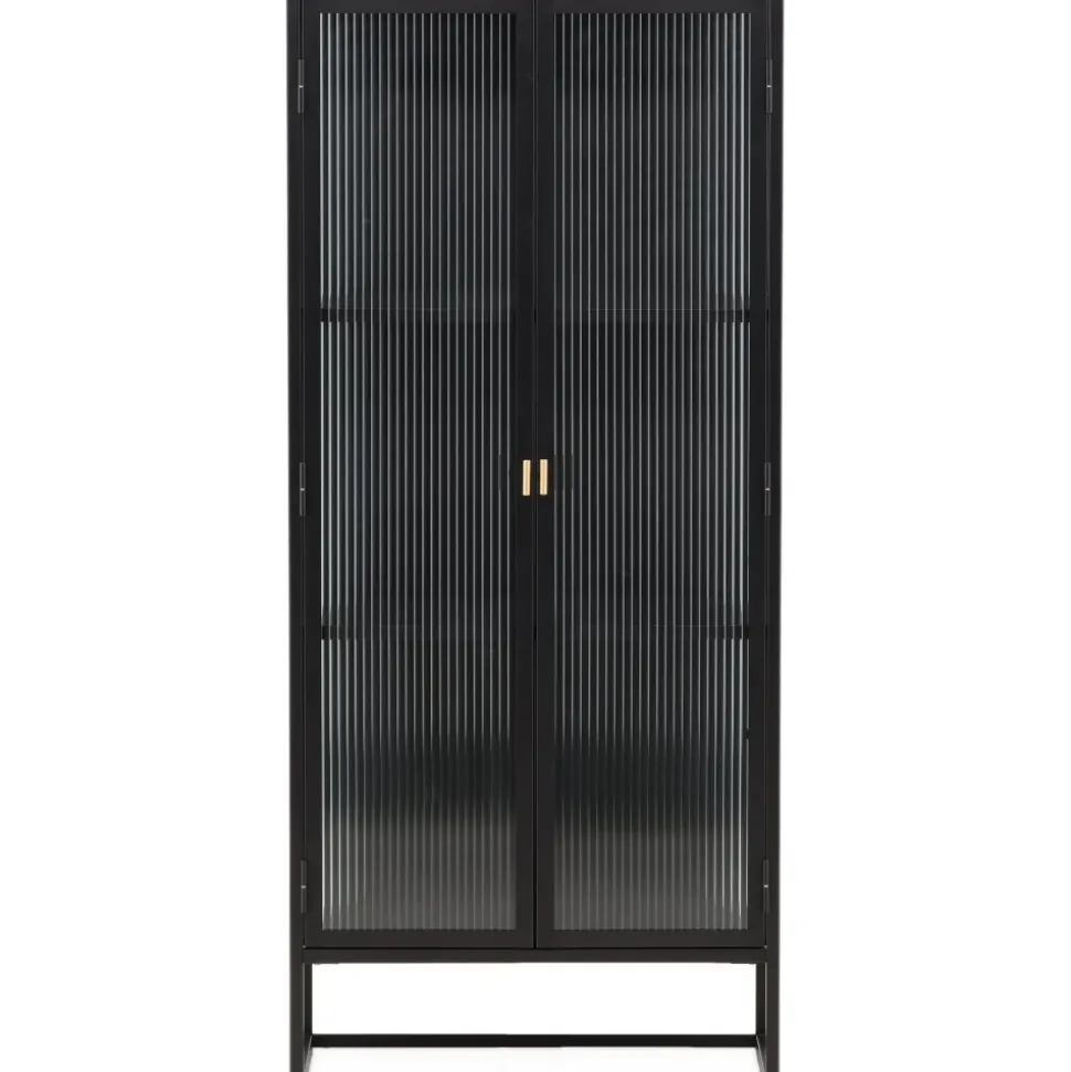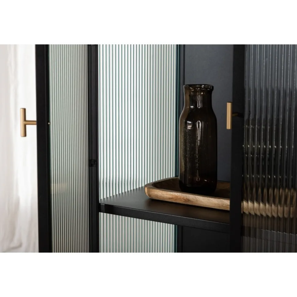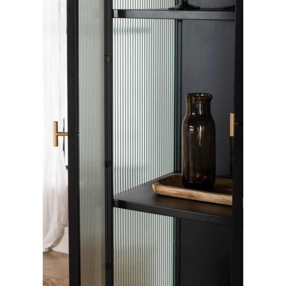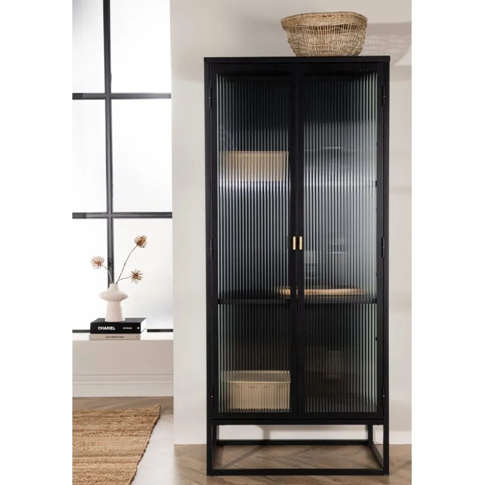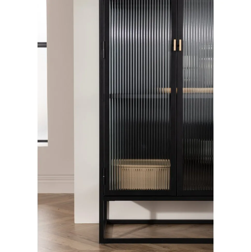 Stilrent och smart – allt man kan önska. Vårt omtyckta skåp Garis gör verkligen ett elegant intryck i vardagsrummet. Designen är iögonfallande med två höga glasdörrar i veckad design och en ram i svart pulverlackerat stål, det här skåpet står sig över tid. Dörrarna har mässingfärgade handtag vilket blir en snygg detalj. Hela skåpet vilar på en öppen ram i svart pulverlackerad stål som ger en luftig känsla och underlättar också för dammsugaren. Här får du en praktisk möbel som passar utmärkt för att förvara porslin eller annat som behöver lite extra utrymme – Inred ditt hem i en trendsäker känsla.