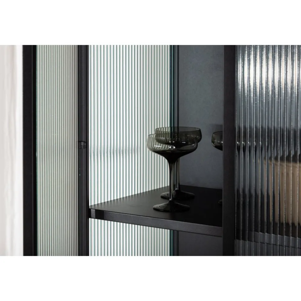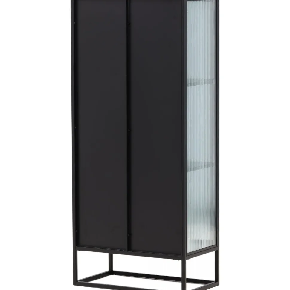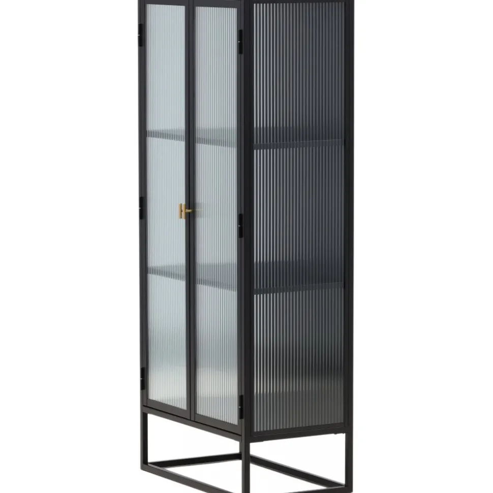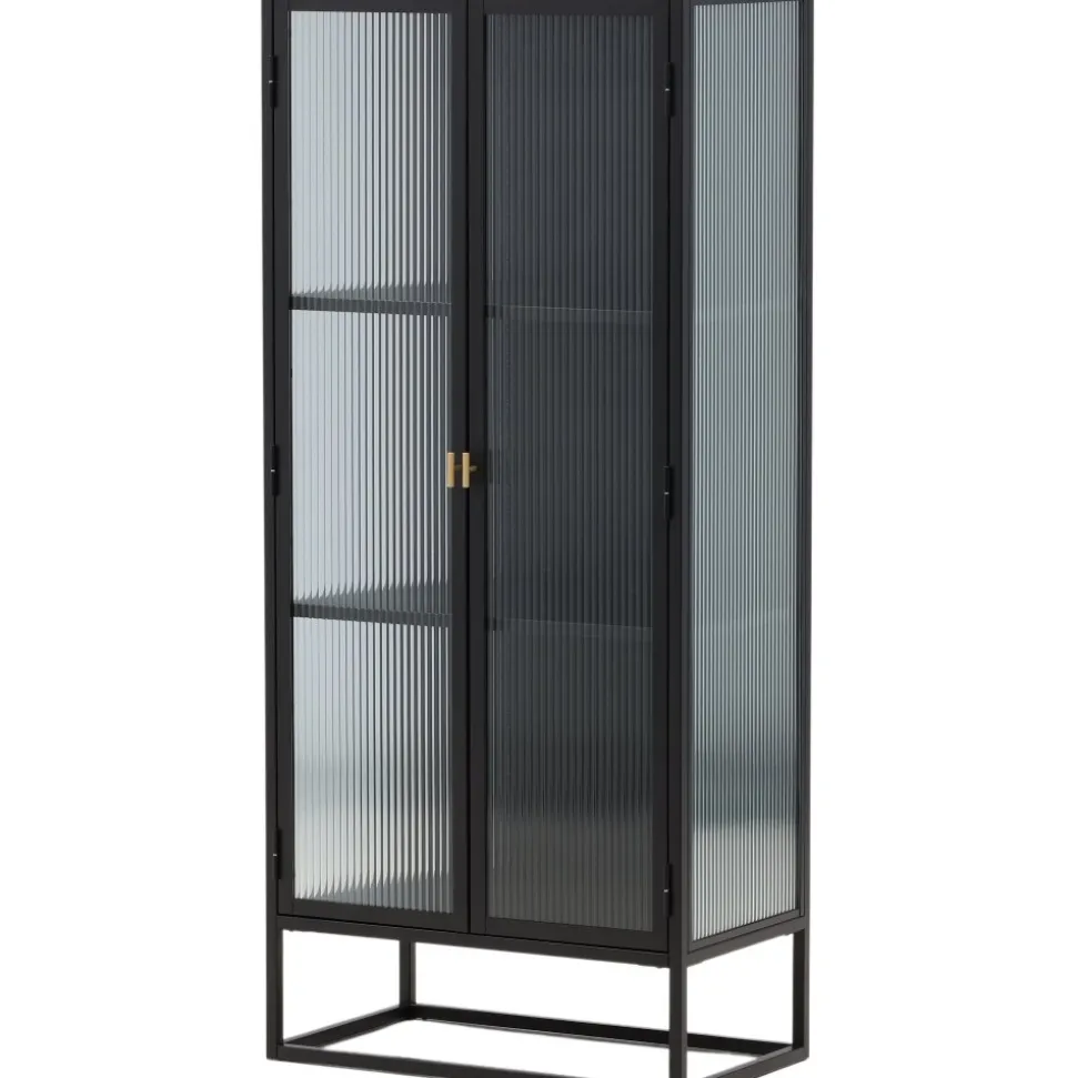 Stilrent och smart – allt man kan önska. Vårt omtyckta skåp Garis gör verkligen ett elegant intryck i vardagsrummet. Designen är iögonfallande med två höga glasdörrar i veckad design och en ram i svart pulverlackerat stål, det här skåpet står sig över tid. Dörrarna har mässingfärgade handtag vilket blir en snygg detalj. Hela skåpet vilar på en öppen ram i svart pulverlackerad stål som ger en luftig känsla och underlättar också för dammsugaren. Här får du en praktisk möbel som passar utmärkt för att förvara porslin eller annat som behöver lite extra utrymme – Inred ditt hem i en trendsäker känsla.